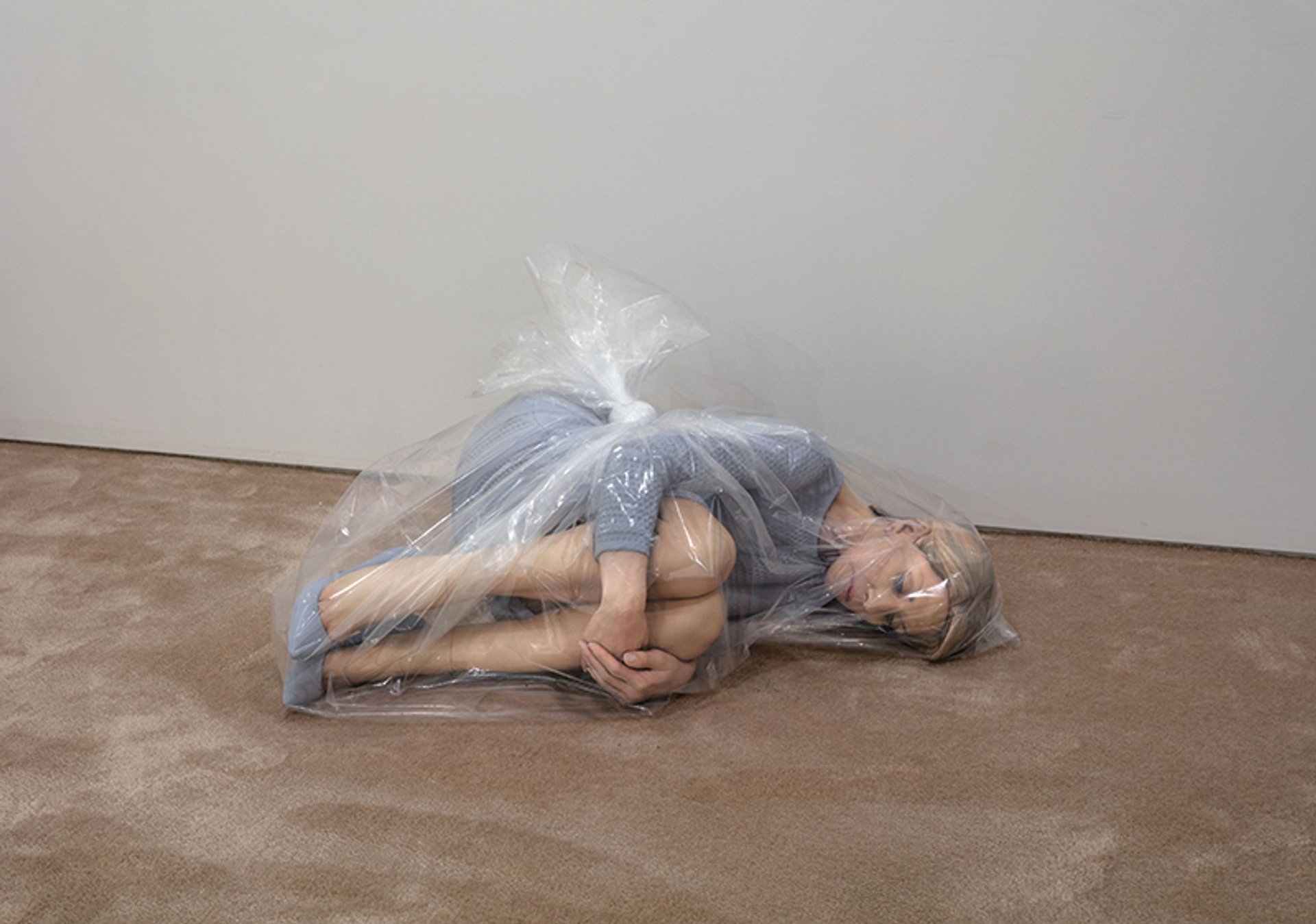 Several pieces deal with the effects of automation on labour and the human body. Josh Kline’s sculpture, Thank you for your years of service (Joann/Lawyer) (2016), shows a well-dressed young professional woman lying in a clear rubbish bag, tossed away like an obsolete appliance. Created using 3D scanning technology, the work is a portrait of a real person who has lost her job.