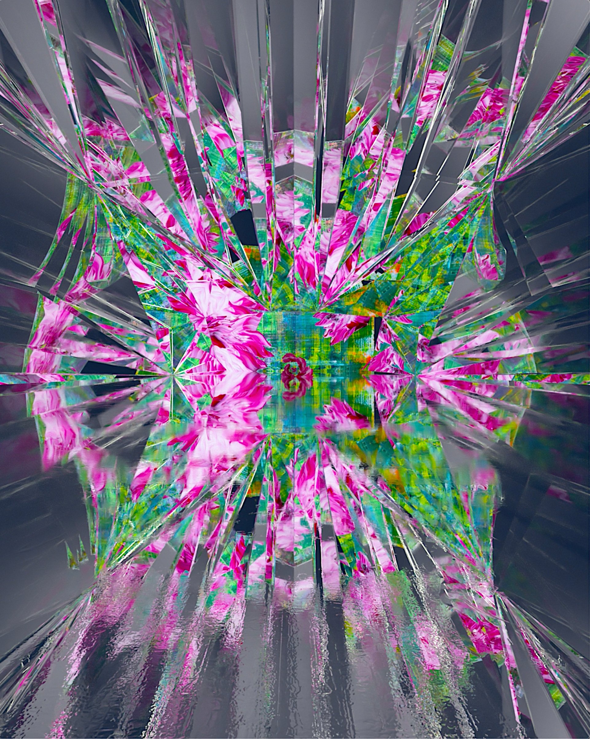 The flowers reappear in a collaborative digital work presented in the hotel’s lobby, produced by the UK digital artist Vector Meldrew, which will be minted into a unique 90-second NFT. There, an image of one of Bakhtiar’s aforementioned paintings disintegrates into rainbow gumballs, which are then recomposed into diamond-like prisms, set to a song composed by the UK rapper Tinie Tempah. Images of the other five paintings will be minted into five 30-second-long NFTs (250-500 editions) and sold on 21 July in a drop on Nifty Gateway.