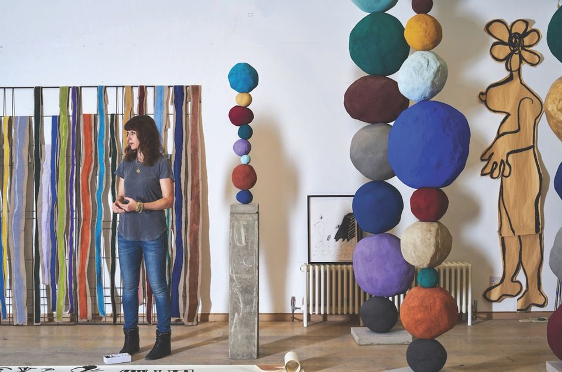When Annie Morris and her husband, the artist Idris Khan’s first child was stillborn, her grief sparked a new series of work: Morris started making biro drawings of women, and adding collage. “Then I started collaging these egg shapes—this egg that I’d been carrying and lost,” Morris says. And it was out of this that her stacked coloured ball sculptures emerged: “I had such a bad experience with the still-birth, then struggling to get pregnant again, in a way this whole body of work would not have existed had that not happened.”