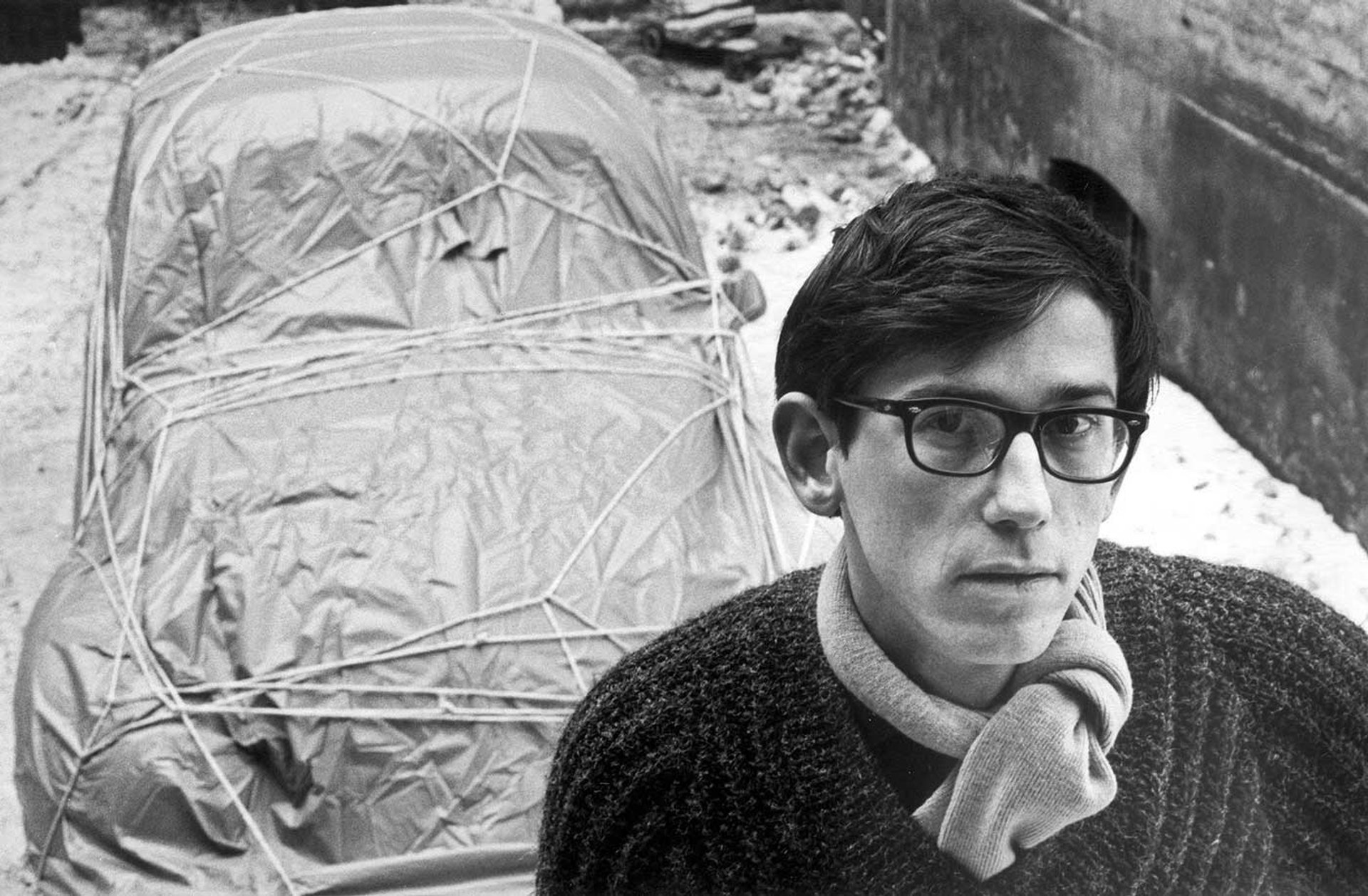 The artist with one of his earliest wrapped works, Wrapped Car (Volkswagen), which he produced in 1963 Charles Wilp; © 1963 Christo