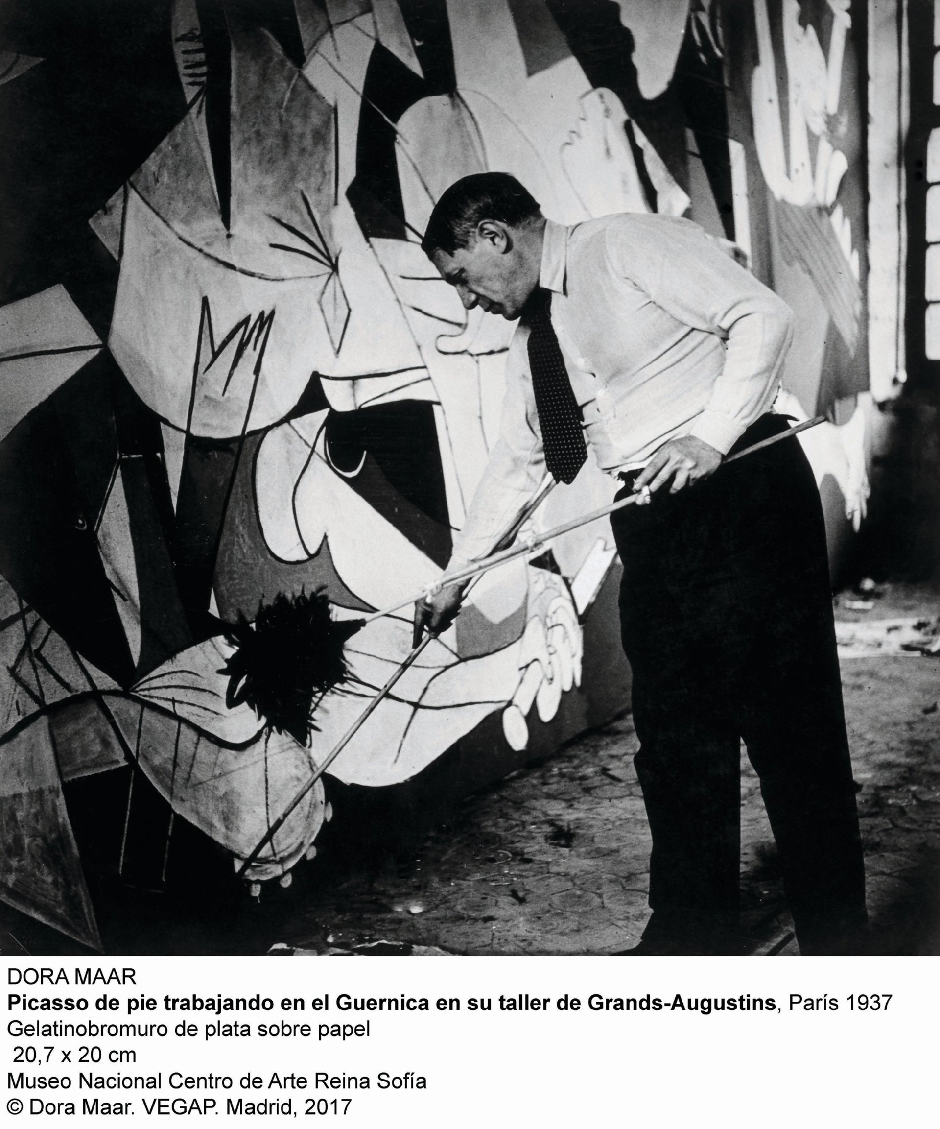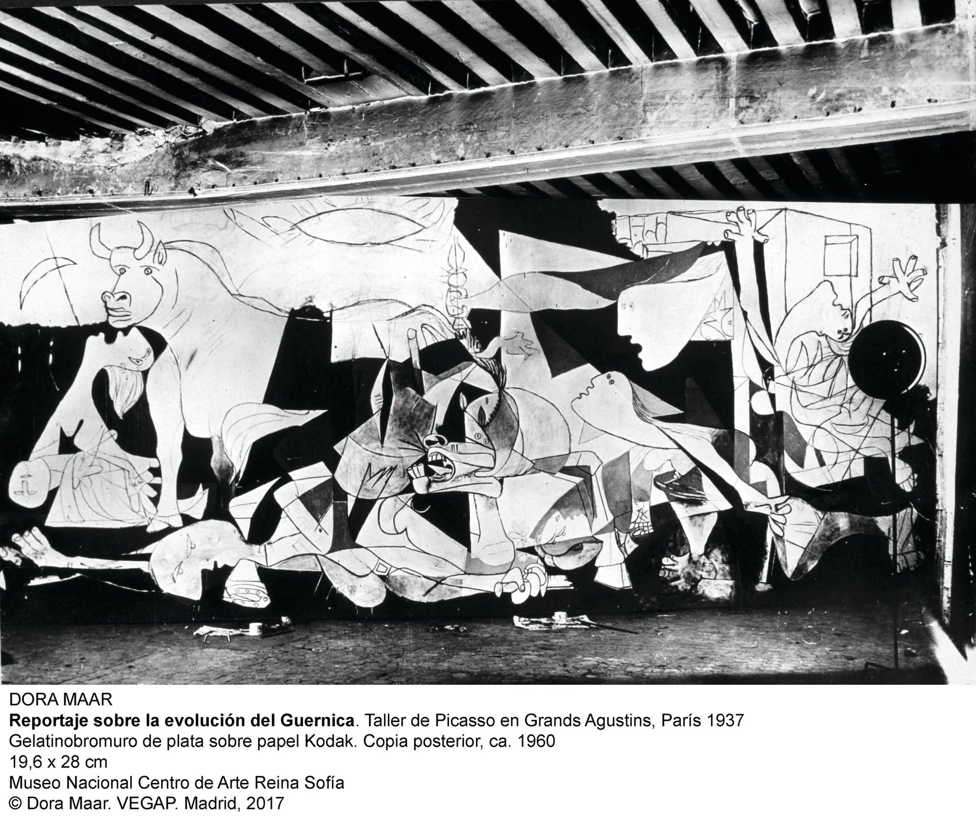 Religious theatre Many of the distinguished artists had tried to dissuade Picasso from testing out colour on Guernica and muddying its appearance. Bergamín reminded Picasso that, as the inventor of collage, he could just stick on scraps of wallpaper to check on the effect rather than applying paint, which would be irreversible. Maar’s photo has recorded the moment for posterity. It was one of the few times that Picasso worked on an image with a certain degree of collaboration. At the end of the meeting Picasso handed to Bergamín a cut-out paper lágrima—a human tear—which he ordered him to keep safe in a reliquary, take out every Friday while Guernica was on show and place on the painting wherever he wanted. Was this mere high jinks? A perfect piece of morbo, a cruel jibe at Maar, whom he regularly cast as his weeping woman? Or did Picasso mean something more profound?