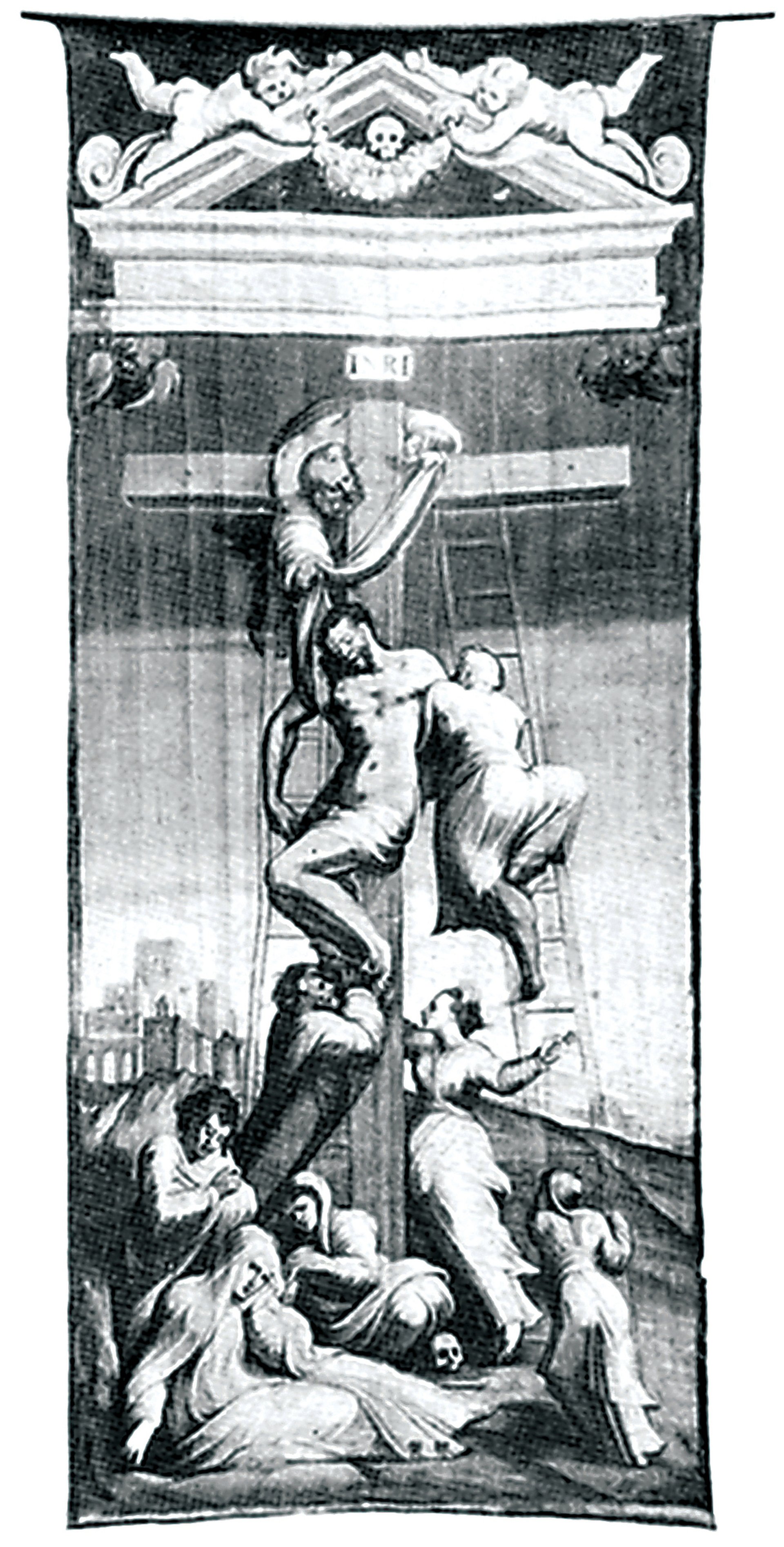 Propaganda piece The profession of sarguero was highly respected and protected by guild status, alongside painters and sculptors. But where the sargueros really came into their own was with the production of sargas for Lent and Holy Week. Sargas set the tone and mood for communal reflection that focus on the tragedy of Christ’s passion. Holy Week is the absolute centre of the Catholic year but also the high point of religious theatre. The Christmas belens—the nativity scenes—are an essentially static art form. Holy Week, on the other hand, is alive, as its rhythmic march leads us towards Good Friday in a profounder pattern of mourning. In many Spanish cathedrals the theatre starts on Palm Sunday as the gold embossed Baroque altars, jammed full of statuary, are covered up within minutes by an ashen veil. A sombre sarga depicting the descent from the cross is hoisted up high on pulleys like the sail of a ship. There are two wonderful examples in Burgo de Osma and Zamora cathedrals. The sarga is there for contemplation and to set the spiritual tone of abject loss that is beyond consolation and literally lost for words. The climax in the life of a sarga is when it is slowly lowered down like a gigantic shroud on Easter Sunday, rolled up and put to sleep, as the high altar is revealed in all its glory to proclaim that Christ has risen, once again, triumphantly from the dead.