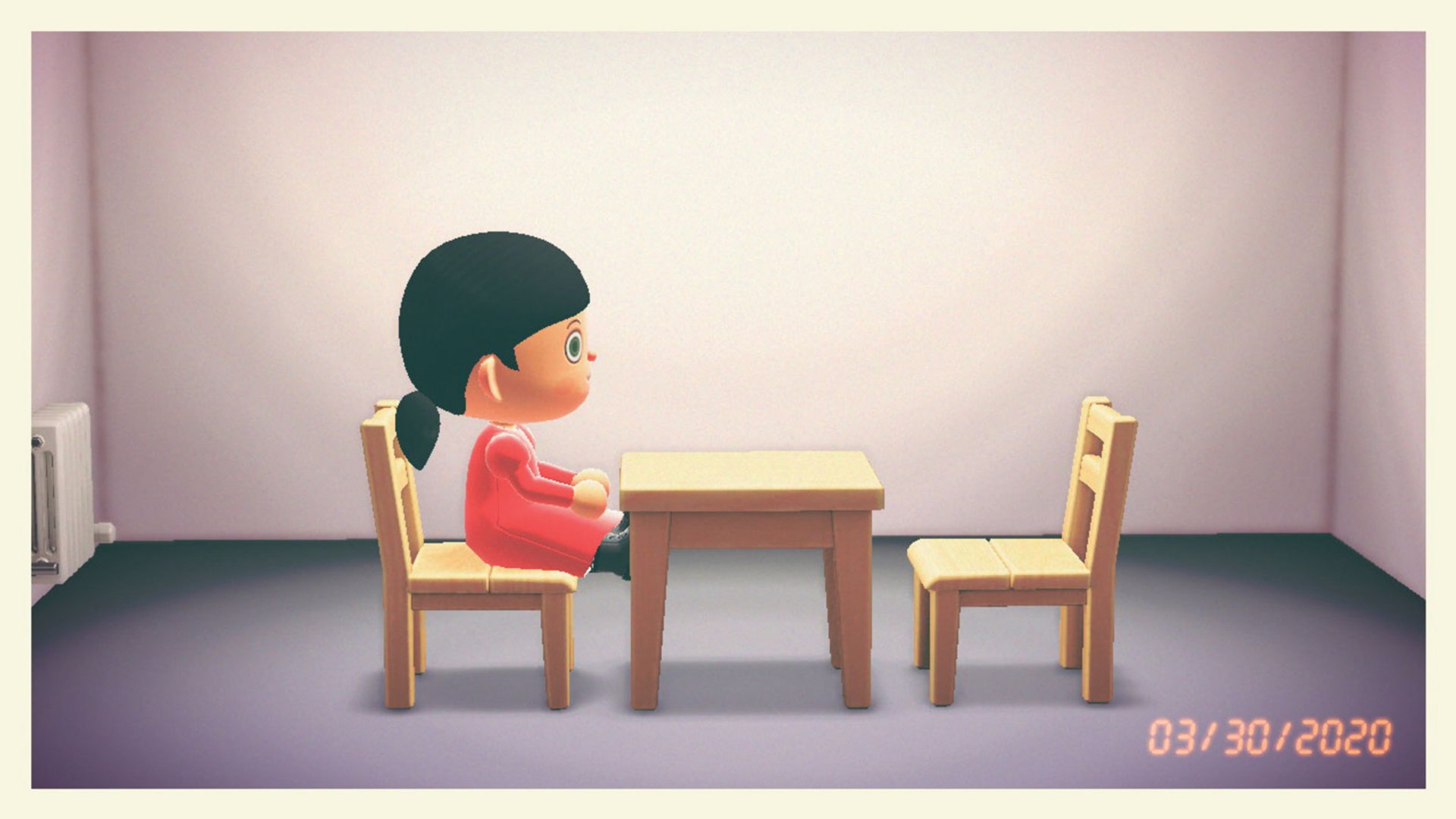 Shing Yin Khor's recreation in Animal Crossing of Marina Abramovic’s 2012 performance The Artist Is Present Courtesy of Shing Yin Khor