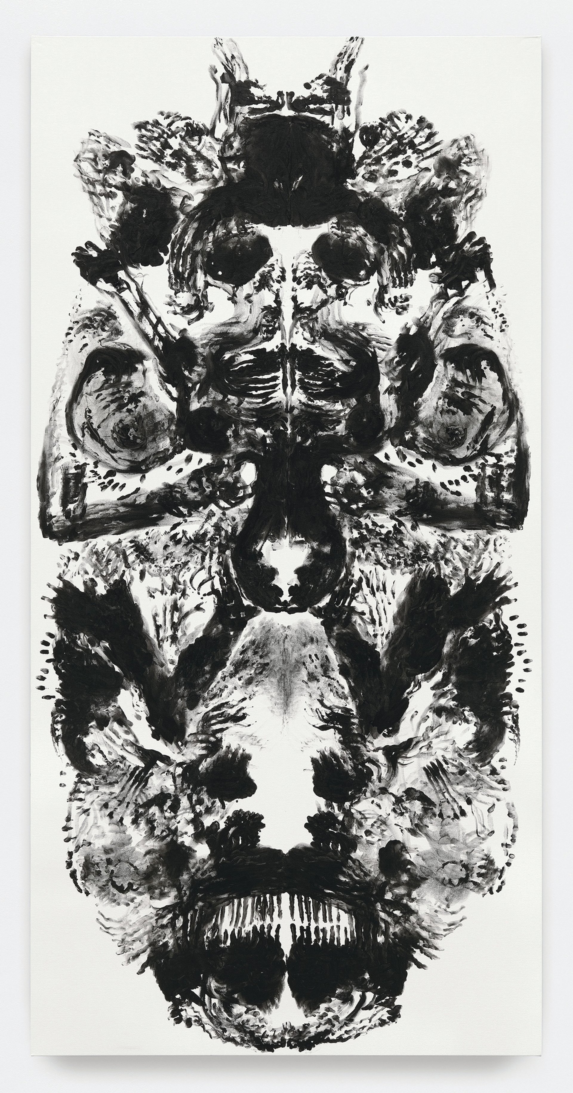 The width is the extent of my arm span and they are double my height. Last summer I made about a dozen that ran the gamut of painterly language and then I started using my fingers to paint, and there was something quite basic about that which I rather liked. But they were still quite wedded to the Is [I paintings] until I made one in which I used both my hands simultaneously and very gesturally and almost blind, because I was right up against the canvas. Then the penny dropped about the bodily proportions and I realised that I could work on that scale and then flip the canvas and be suddenly in dialogue with the other end in a kind of double mirroring. I realised that I could do symmetry quite successfully—maybe all of us can—and I also noticed that something quite curious happens in that, if you give a mark its mirror, almost any gesture gains a kind of authority or purpose. So I made three all in one day and was very excited about what was transpiring, although I didn’t have much purpose or end point in mind. Afterwards I had to go away for a week, but was very excited about getting back to them and they soon developed a life of their own: making them has now become rather addictive.