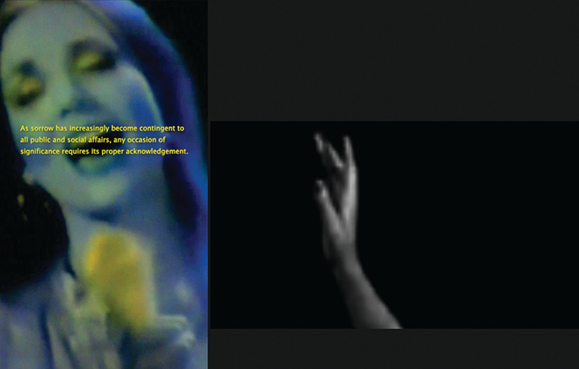 Price considers K to be “probably the first film I wrote that was more like a short story”. On one screen a stop-frame animation of the sun—created from thousands of glass-plate slides taken between 1870 and 1948—plays continuously. On the other, a CGI animation of the production of nylon stockings, each packaged under the brand name K, is interrupted—or accompanied—by footage of dancing performers, including the 1970s country singer Crystal Gale. Binding these visual elements together is a narrative composed by Price and attributed to the Krystals, a fictional group of “professional mourners” who perform not only at funerals but also christenings, weddings and art exhibitions.