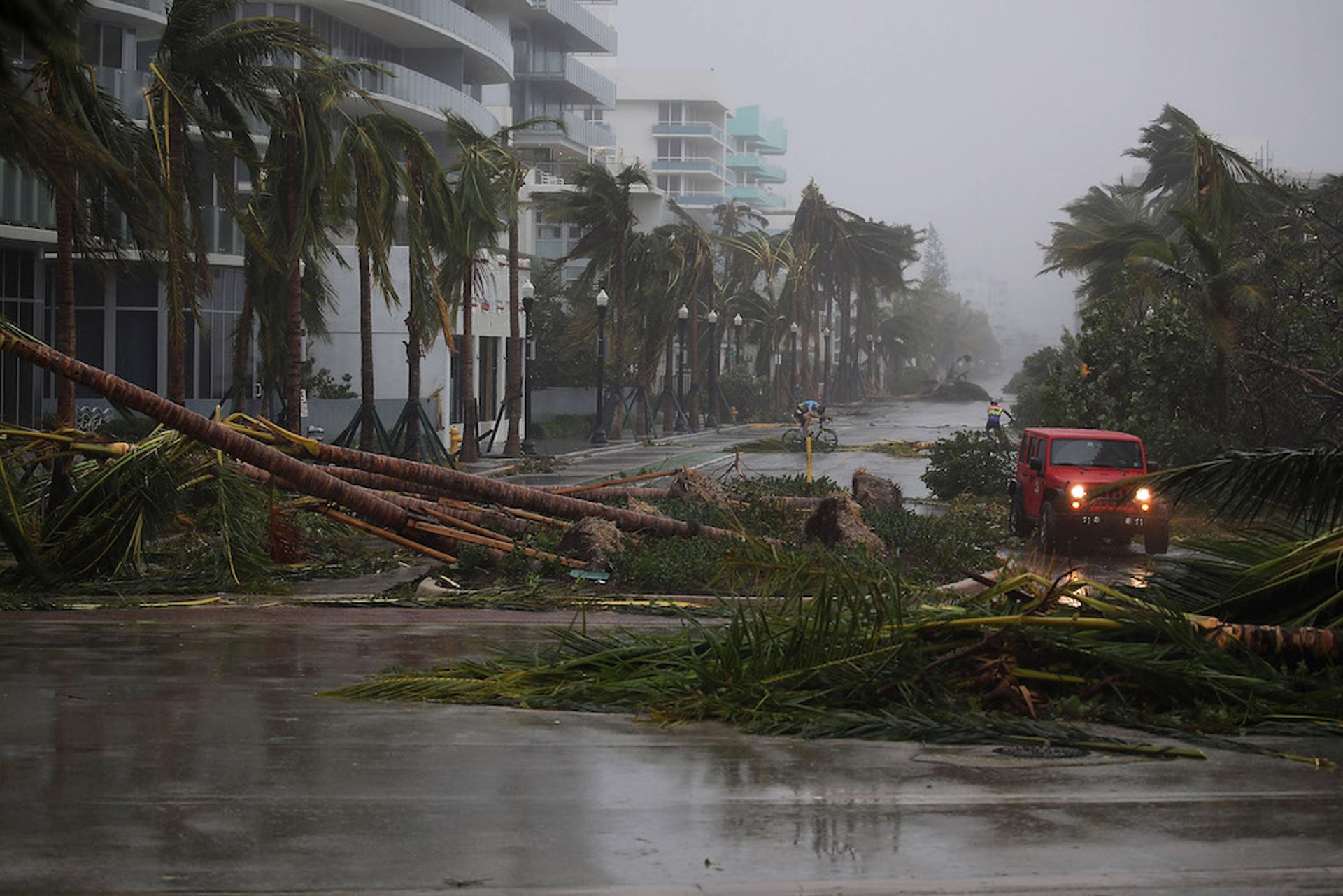 A vehicle passes downed palm trees and two cyclists attempt to ride as Hurricane Irma passed through the area on September 10, 2017 in Miami Beach, Florida. Florida is taking a direct hit by the Hurricane which made landfall in the Florida Keys as a Category 4 storm on Sunday, lashing the state with 130 mph winds as it moves up the coast. Joe Raedle/Getty Images