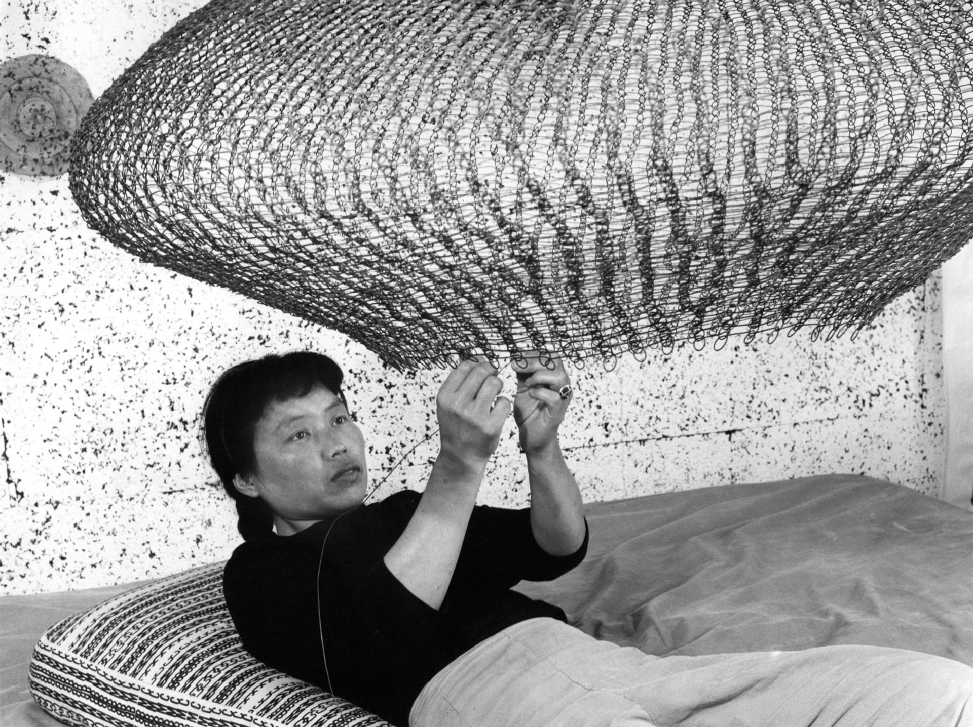 Ruth Asawa reclining and encircled by a looped-wire sculpture in 1951 © 2019 Imogen Cunningham Trust