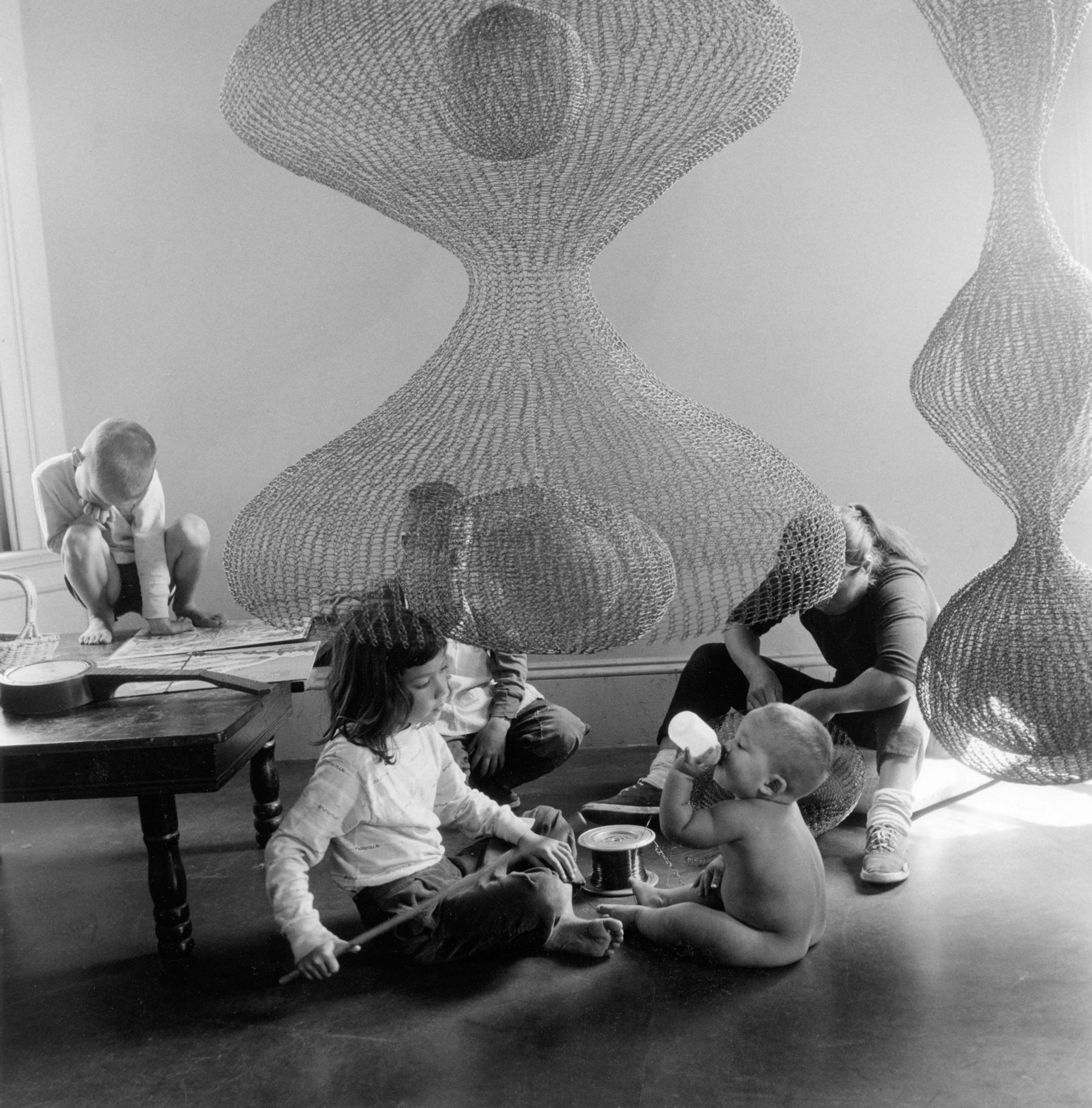 Asawa at work in her home studio surrounded by her children in 1957 © 2019 Imogen Cunningham Trust