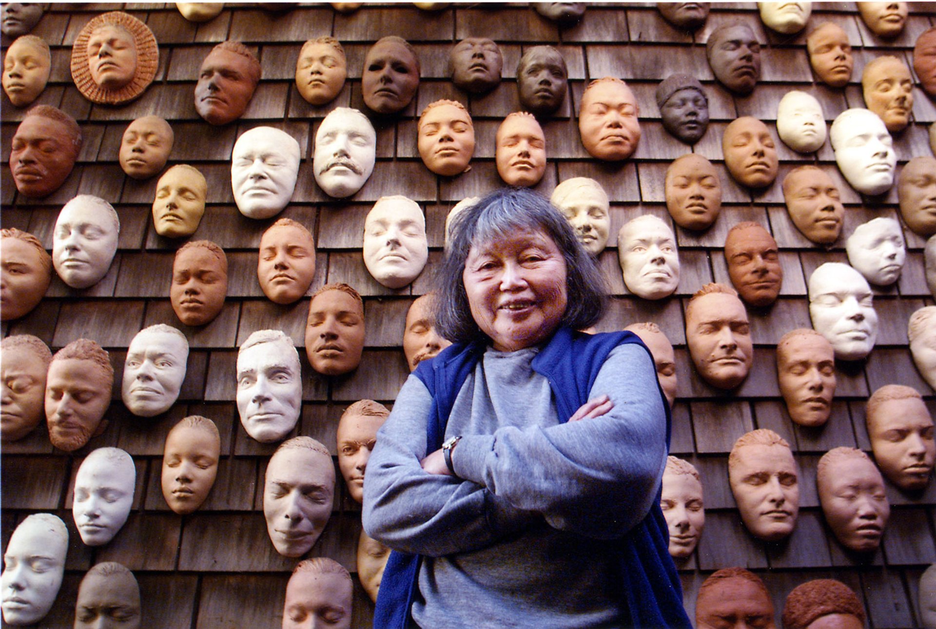 Asawa with life masks on the exterior wall of her house in 1988 © Terry Schmitt