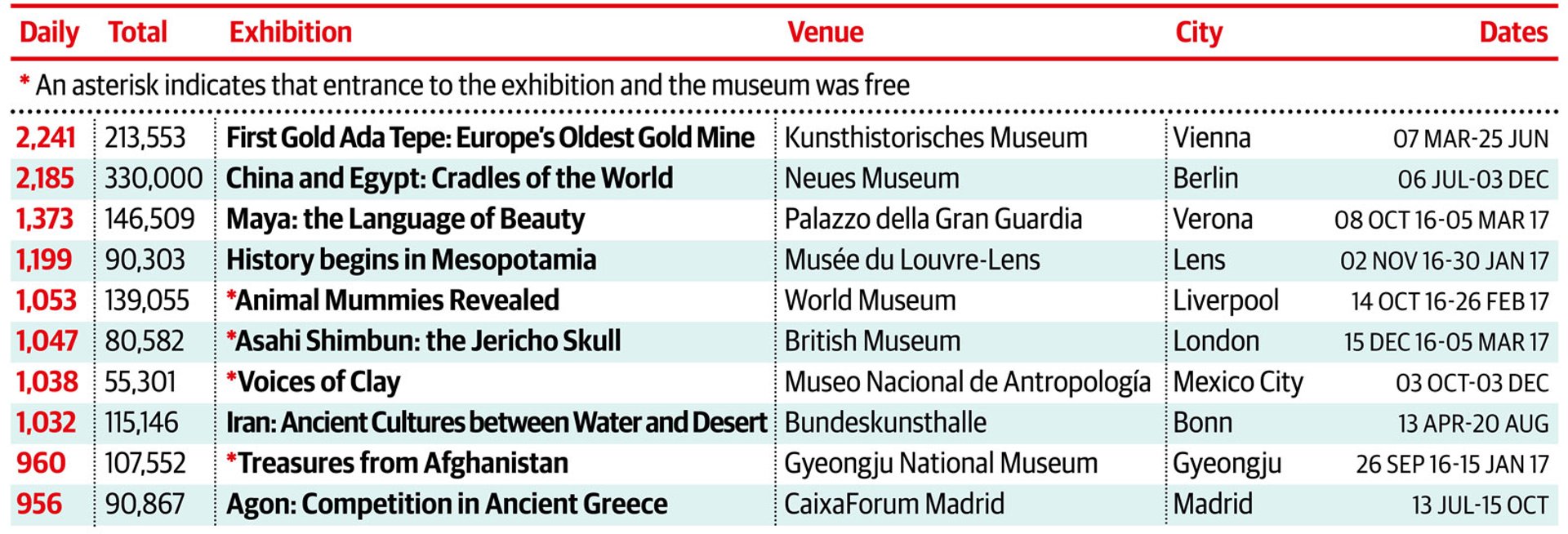 The most popular antiquities shows usually have a wide geographical spread, both in terms of host institutions and cultures being explored, and this year is no exception. The Kunsthistorisches Museum in Vienna struck gold with its choice selection of artefacts found at the ancient Bulgarian site of Ada Tepe, Europe’s oldest gold mine. With 2,241 visitors a day, it was the most popular antiquities show of 2017. The ancient civilisations of the Americas feature twice in the top ten, with a show on the Mayans at the Palazzo della Gran Guardia (around 1,373 visitors a day) taking third place and a display of Mesoamerican pottery in Mexico City coming in seventh. Animal mummies, including jackals and crocodiles, as well as a recreation of an animal catacomb, pulled in the crowds in Liverpool (1,053 visitors a day), and a travelling exhibition of objects from the British Museum that looks at competition in Ancient Greek, held in Madrid, rounds out the top ten.
