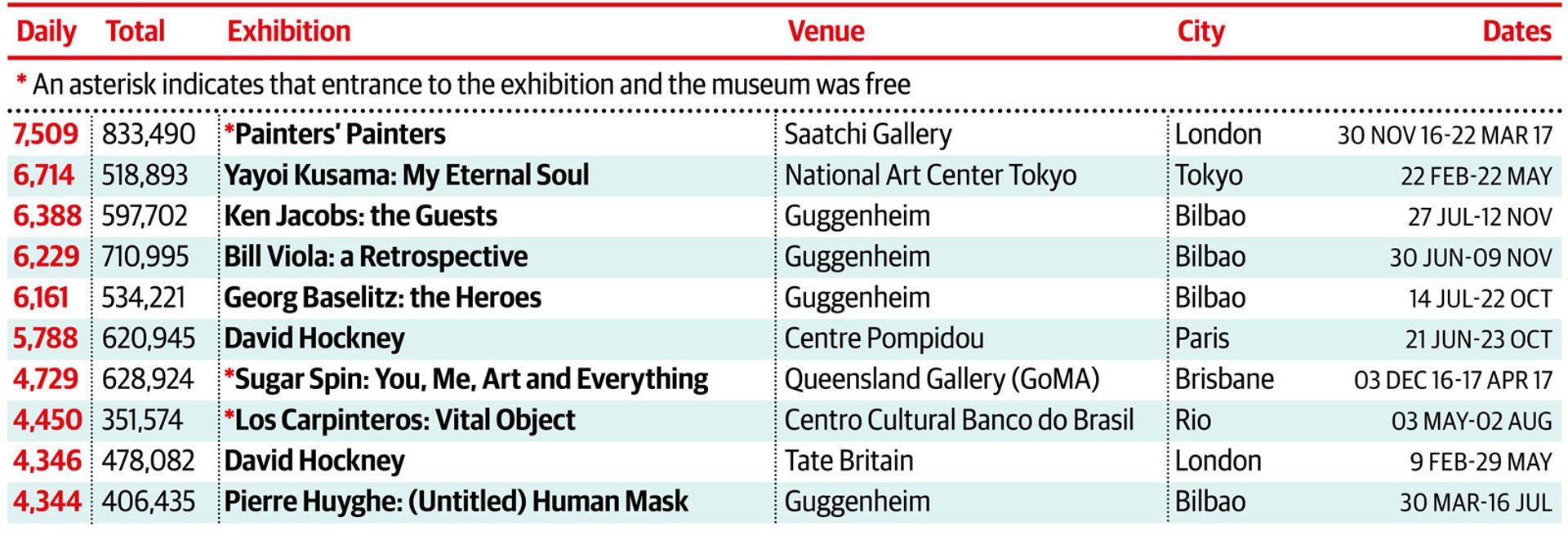 The Saatchi Gallery’s exhibitions are a consistent presence in this list, proving that poor reviews and general art-world apathy are no barrier to the creation of significant footfall in Chelsea. The 7,509 visitors a day for Painters’ Painters beggars belief. Unlike Saatchi’s free shows, those that charge fees give an accurate indication of the popularity of particular artists, and it is no surprise to see Bill Viola and Yayoi Kusama, two ubiquitous figures internationally, attracting huge numbers. Pierre Huyghe, much acclaimed by critics, has benefited from surely his largest-ever public audience at the Guggenheim in Bilbao. But the title of most popular artist of the year must go to David Hockney: his show at Tate Britain prompted around 478,000 people to part with their money, just for him, and then a further 621,000 saw the exhibition at the Centre Pompidou as part of a general-entry ticket. It means that across the two cities, around 1.1 million people saw the retrospective.