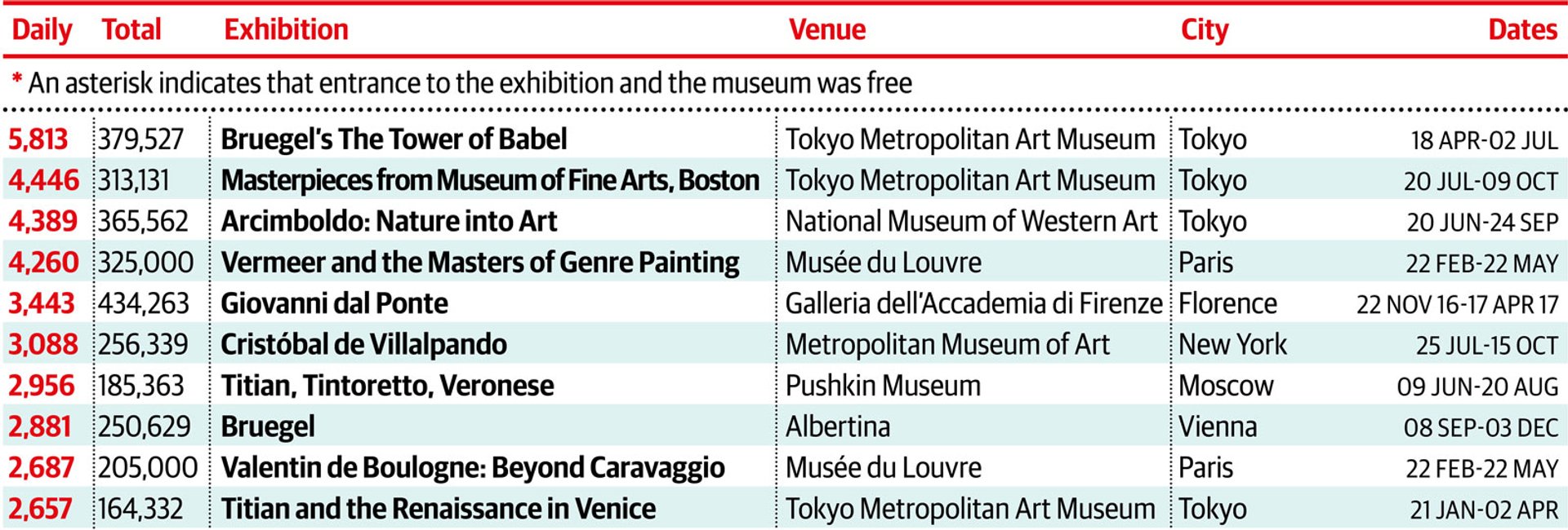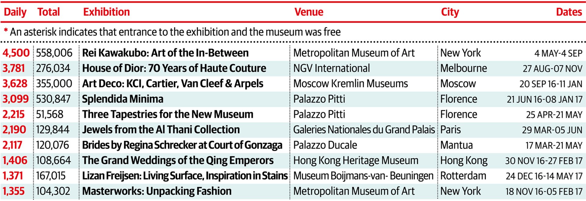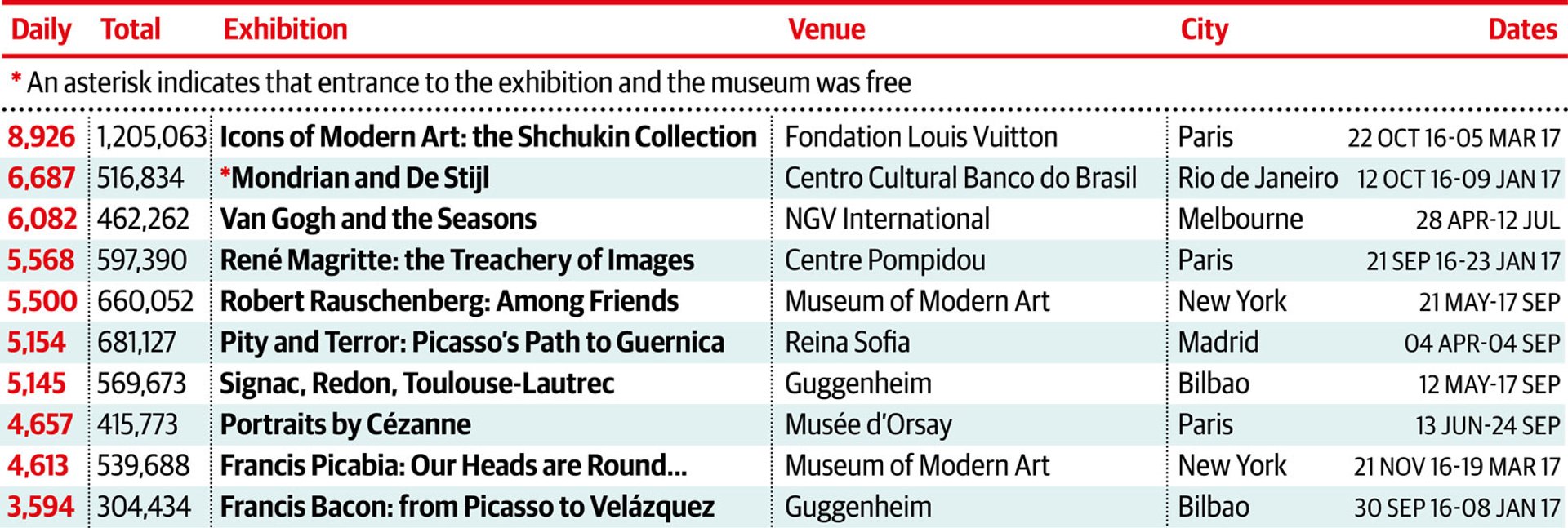 The Fondation Louis Vuitton’s blockbuster smashes into the top spot, beating the Centro Cultural Banco do Brasil, which topped this category in our last survey. The Brazilian venue is the only free show—a contrast to 2016, when six of the top ten were free. The next best-attended charging show was Van Gogh in Melbourne—a familiar artist in this category, but at a venue that is more unlikely. It is striking that pre-war and European Modern art still edges post-war American developments in terms of public appeal: the Shchukin collection, with its Matisses, Gauguins, etc, and Mondrian, Van Gogh, Magritte, Picasso, Cézanne and Picabia all feature in the top ten. Rauschenberg is the only US artist in the list, while two of the showings of a touring Abstract Expressionism exhibition, at the Guggenheim Bilbao and the Royal Academy in London, were just outside the top ten.