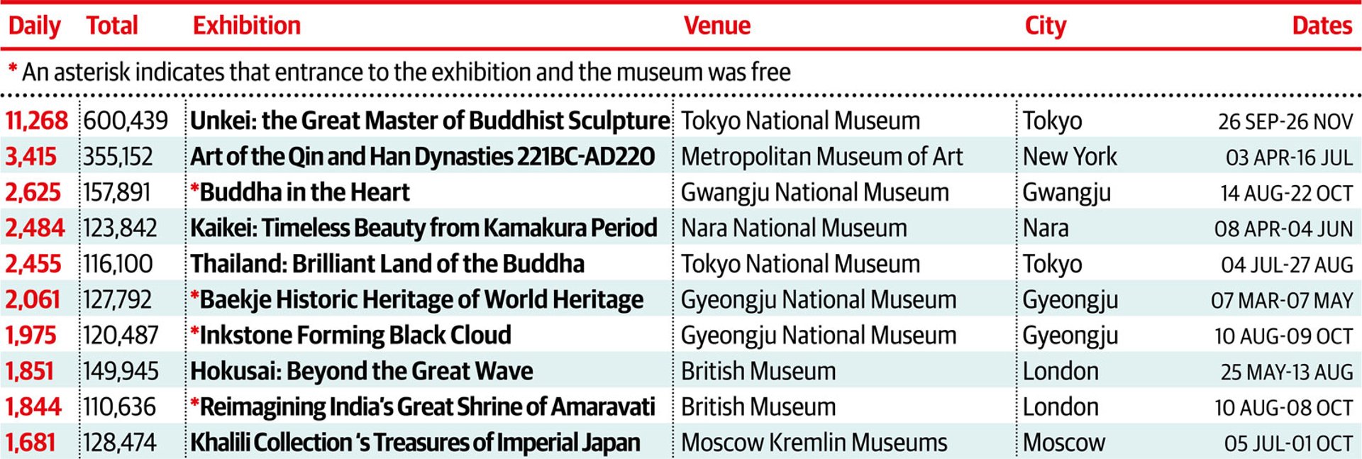 The Tokyo National Museum is a regular in this category. There were 11,268 visitors a day to the blockbuster presentation of two-dozen sculptures by the celebrated Japanese artist Unkei (around 1150-1223). As the premiere sculptor of Buddhist figures in the early Kamakura period, he received commissions from some of the most prestigious temples and aristocratic families of the period. It is both the top exhibition in this category, as well as the most-visited show in our overall survey. Another exhibition on the Kamakura, at the Nara National Museum, pulled in 2,484 visitors a day over a three-month period. A newcomer to the list, however, is the institution behind the second most-visited show: the Metropolitan Museum of Art. One of the last exhibitions staged under the leadership of the New York institution’s former director, Thomas Campbell, the major loan of ancient Chinese art from the Qin and Han dynasties included more than 160 works from 32 institutions in China and was seen by 3,415 visitors a day.