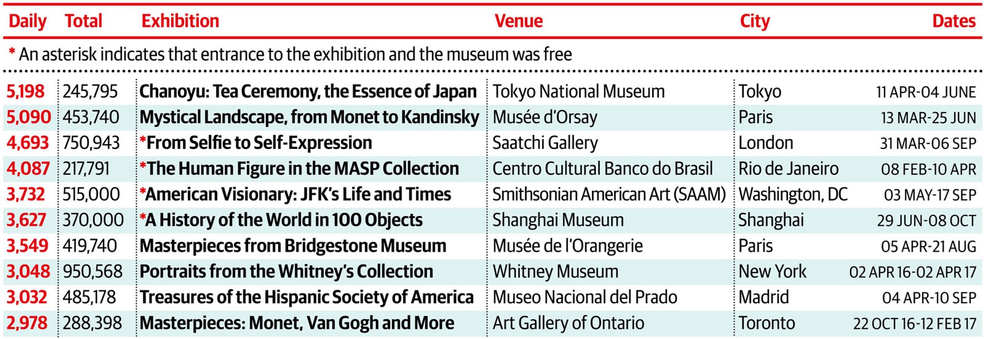 One of the joys of the thematic category, which includes exhibitions linked by theme rather than by time period or genre, is that you never know what to expect. In 2017, four exhibitions in our top ten focus on portraits or the human form, from the selfie—an example of 21st-century narcissism at its best—to two decades of photographs of the US President John F. Kennedy and his family. The Saatchi Gallery comes in third with its selfie celebration, which drew 4,693 visitors a day, while 3,732 people a day went to the Smithsonian American Art Museum to see portraits of the people’s president, helping to place the show in fifth position. But the top show was one on the art of the Japanese tea ceremony at the Tokyo National Museum, which had 5,198 visitors a day. A travelling show from the British Museum, A History of the World in 100 Objects, had a respectable showing in Shanghai with 3,627 visitors a day.