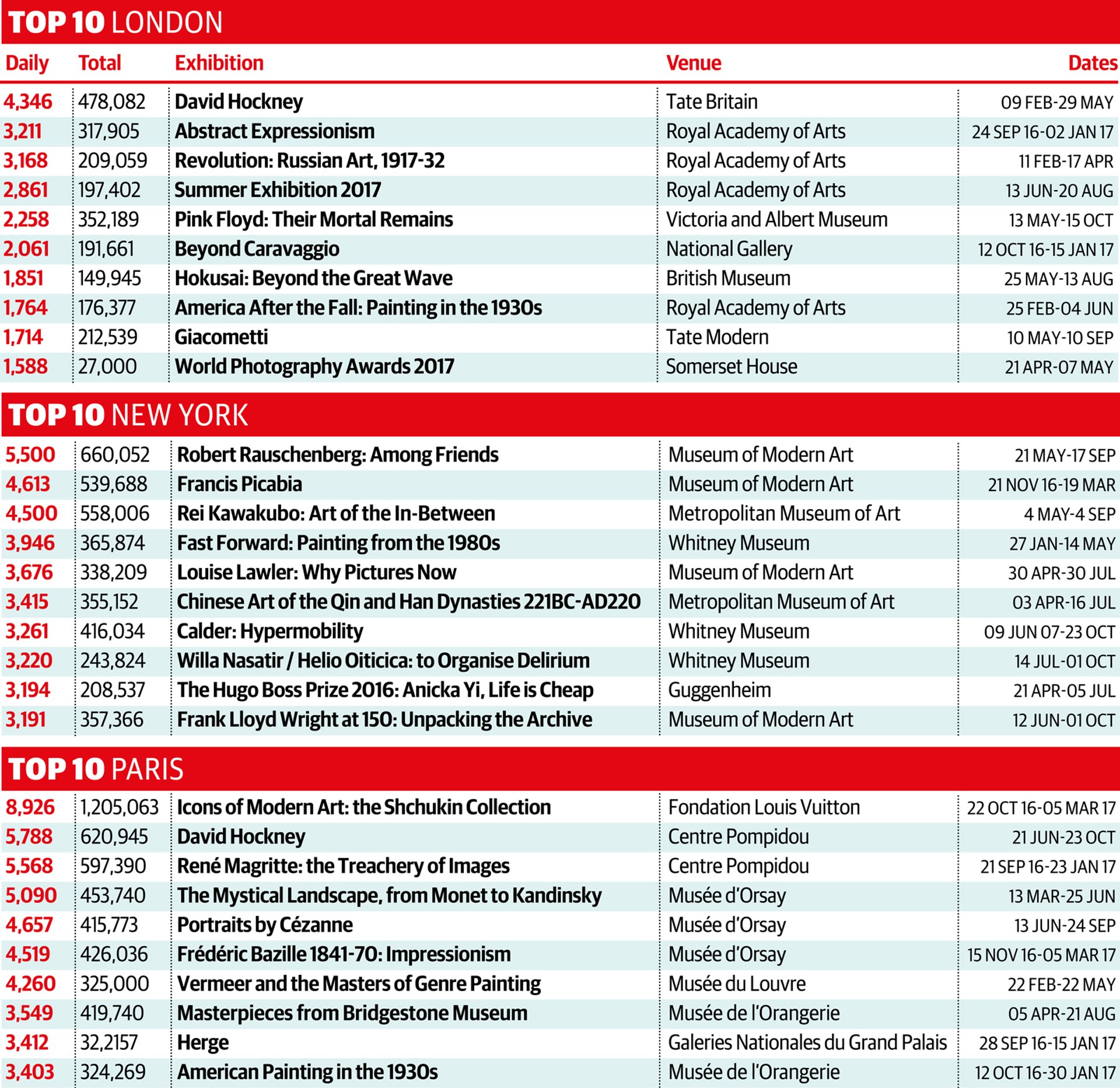 The David Hockney retrospective at Tate Britain gave the museum a much-needed boost after years of dwindling attendance, pushing total visitor numbers to the museum to a record 1.8 million in 2017. While the blockbuster show had 4,346 visitors a day in London, it did even better when it travelled to the Centre Pompidou in Paris, where it was seen by 5,788 visitors a day. However, this was not enough to take the top spot in the French capital, where the Modern masterpieces from the Shchukin Collection—by Picasso, Matisse and Gauguin, among others—were seen by a staggering 8,926 visitors a day. The exhibition at the Fondation Louis Vuitton came second in our overall exhibitions list. In New York, the Robert Rauschenberg survey at the Museum of Modern Art came out on top, with 5,500 visitors a day. The exhibition, subtitled Among Friends, was a slightly bigger version of the survey at Tate Modern last year, which, with 1,456 visitors a day, missed out on the London top ten.