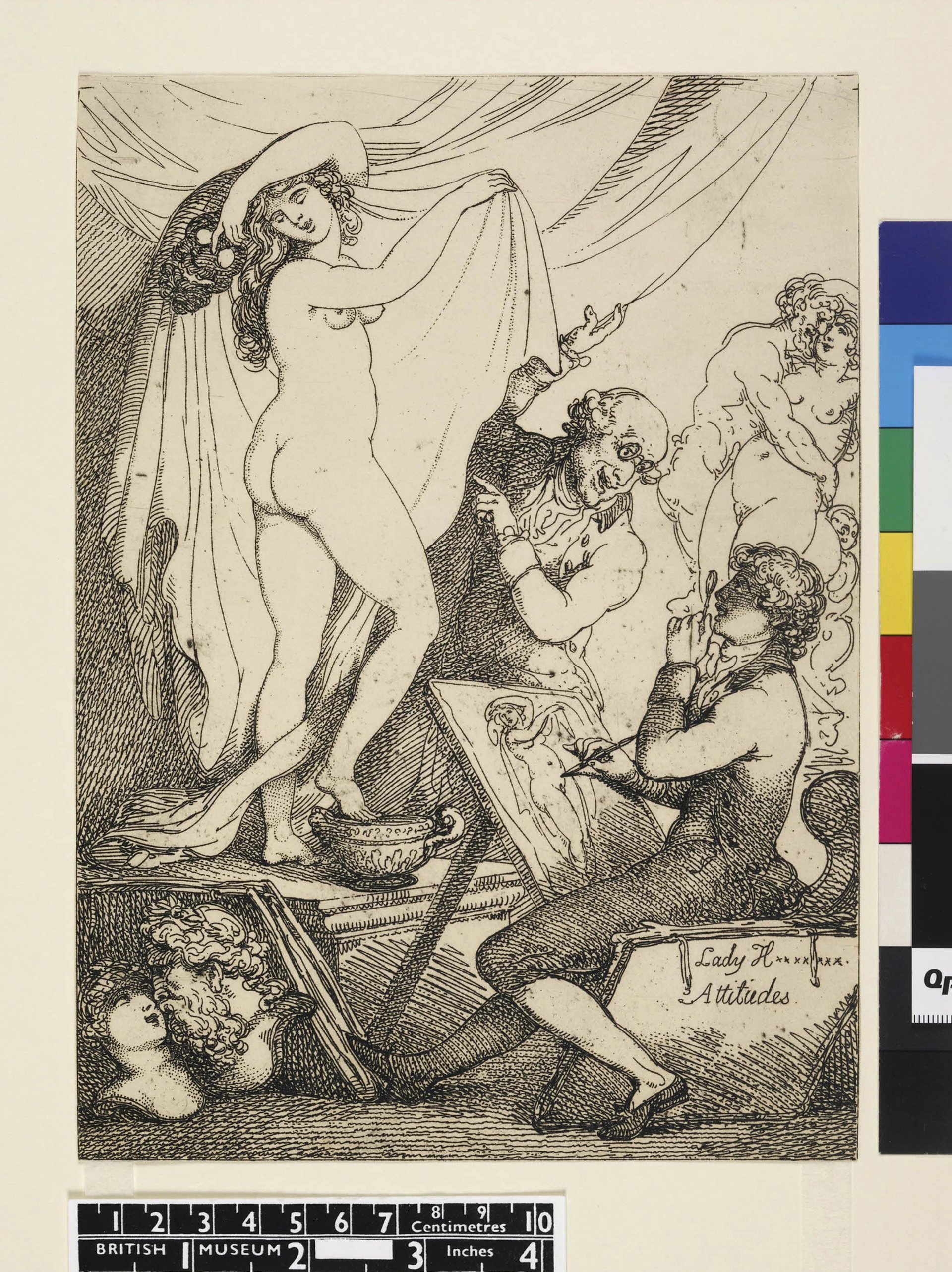 A “Breathing Statue” Hamilton told visitors that he loved Emma because she looked like an ancient beauty on one of his Greek vases. In turn, visitors called her a “Breathing Statue” or Hamilton’s “pantomime mistress”, his “gallery of statues”. Emma could be a whole gallery because she and Hamilton had invented a new art form, performances of “Attitudes”. Emma appeared before Hamilton’s guests in a specially made Greek-style dress, a shawl or two, and seductively unpinned hair, then took a series of poses, each with a different arrangement of shawl and hair, to imitate ancient mythological or historical characters such as Medea or Cleopatra: “With the assistance of one or two Etruscan vases and an urn, she takes almost every attitude of the finest antique figures successively,” wrote the politician and scholar John B. S. Morritt, “and varying in a moment the folds of her shawls, the flow of her hair; and her wonderful countenance is at one instant a Sibyl, then a Fury, a Niobe, a Sophonisba drinking poison, a Bacchante drinking wine, dancing, and playing the tambourine, an Agrippina at the tomb of Germanicus, and every different attitude of almost every different passion… This wonderful variety is always delicately elegant, and entirely studied from the antique designs of vases and the figures of Herculaneum.”