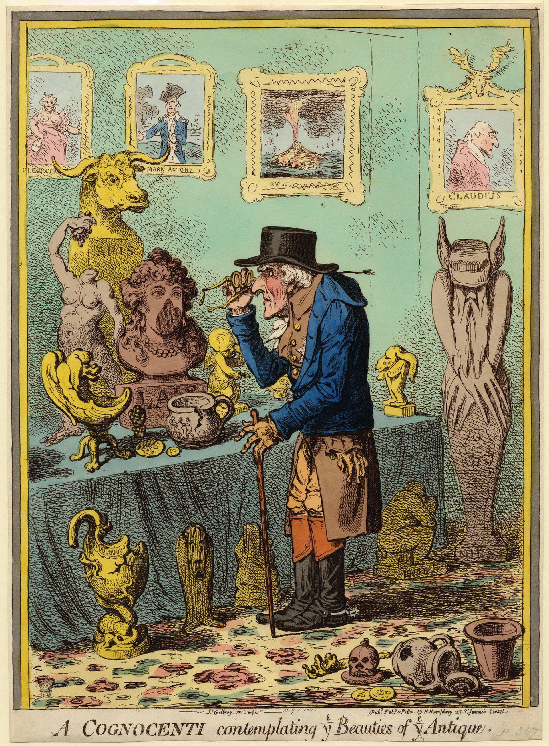 Their strange arrangement caused endless scandal. Caricaturists published parodies of the trio. One showed an obese Emma, surrounded by bottles, scattered antiquities in licentious poses, and a deeply slumbering husband, mourning the departure of Nelson as if in one of her Attitudes, impersonating Dido, the tragic queen of the Aeneid, who threw herself on a funeral pyre when her lover sailed away. Another shows the withered Hamilton, peering shortsightedly at a broken Roman statue and ignoring the cavorting of Emma and Nelson, shown as portraits of Cleopatra and Mark Antony, his gloves falling limply out of his pocket to symbolise his lack of sexual ability.