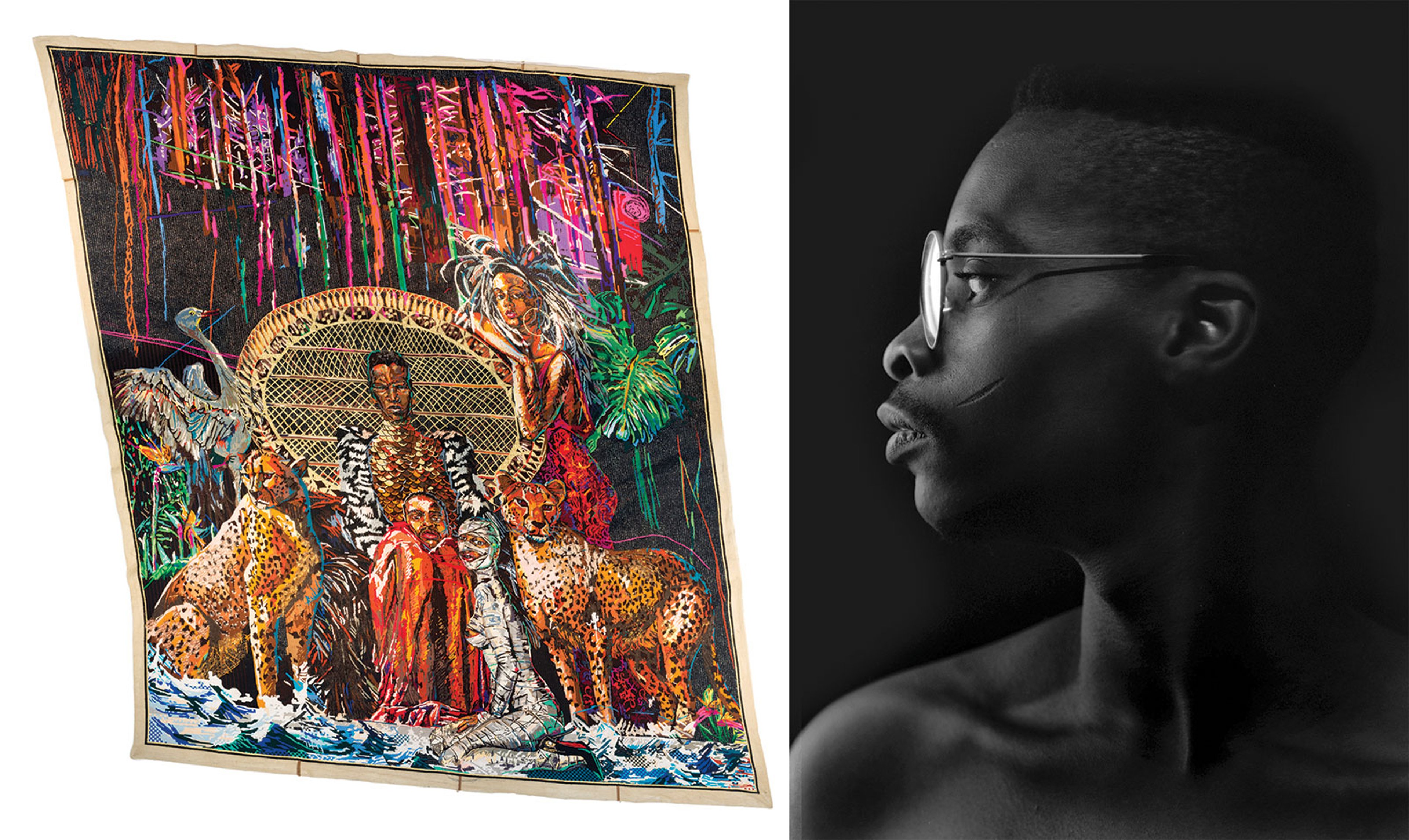 Athi-Patra Ruga (b. 1984), showing with WHATIFTHEWORLD, Cape Town. One might not immediately guess from Athi-Patra Ruga’s lush, technicolour tapestries, installations and photographs—a bouquet of balloons sprouting from red-stockinged legs, or a regal figure in a lace catsuit on a floral throne—that South Africa’s grim legacy of apartheid was his ultimate source material. Creating what he describes as a “mythical metaverse” populated by a cast of queer characters (all portrayed by Ruga), the artist stages narrative works as a way of proposing alternative political and social realities. Above, Athi-Patra Ruga, Lizalis Indinga Lakho / Autistik Imperium (2017) Image courtesy of Athi-Patra Ruga and WHATIFTHEWORLD