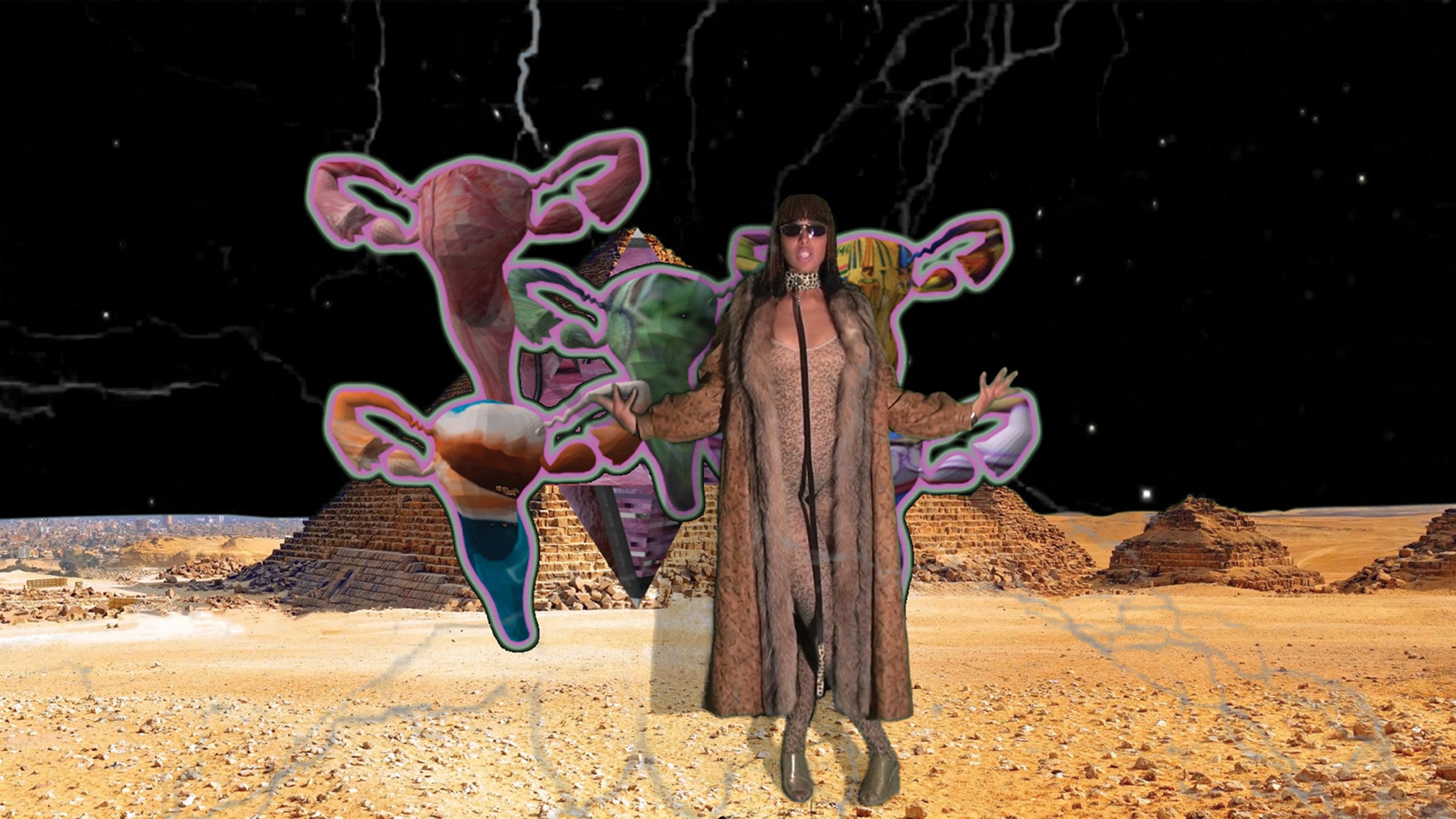 Tabita Rezaire (b. 1989), showing with Goodman Gallery, Johannesburg. The French artist Tabita Rezaire produces digital works and acrylic mounted prints that deal with race and feminism—what she calls “digital healing activism”. Rezaire says the internet, like the world outside, is “exploitative, exclusionary, classicist, patriarchal, racist, homophobic, coercive and manipulative”. Typically featuring herself as the subject, her works are scattered with text like “exotic exhaustion”, “#reparations” and, as she is also a Kemetic yoga teacher, positive affirmations, such as “vibrate the cosmos and the cosmos shall steer the path”. Above, Tabita Rezaire, Hoetep Blessings (2016)