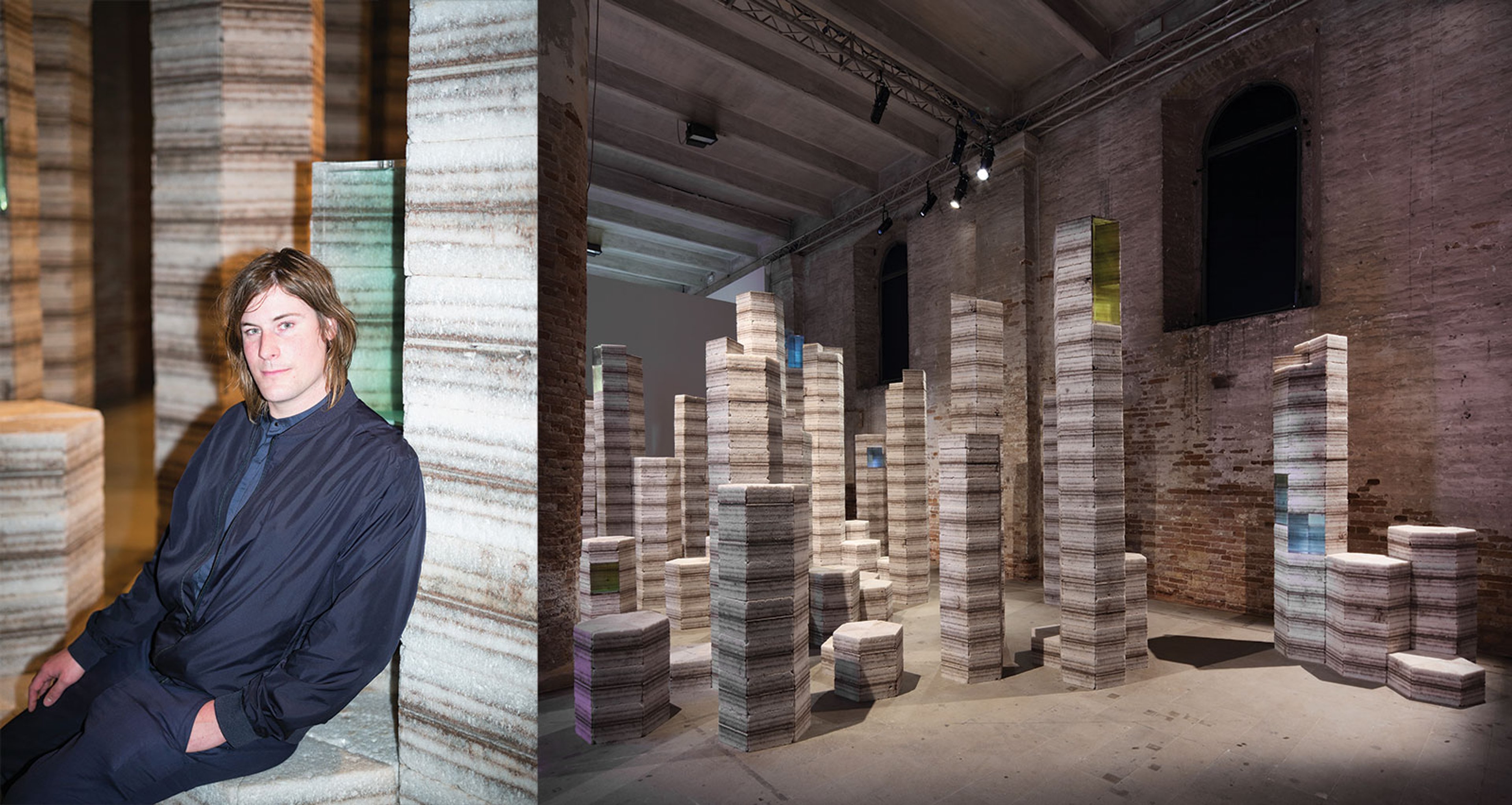 Julian Charrière (b. 1987), showing with Dittrich & Schlechtriem, Berlin. “The point where beauty and atrocity coalesce within the unknown is sometimes the right terrain to start a new project,” says the Swiss artist Julian Charrière of his research-based work, which has increasingly focused on technology and geology. Here, he is showing Future Fossil Spaces (2017), an installation of lithium vats and salt-brick towers from Salar de Uyuni, Bolivia, the largest salt flat in the world. The Bolivian government plans to mine the site for lithium, a necessary component in batteries, which would upend the landscape. Photo: Christian Werner