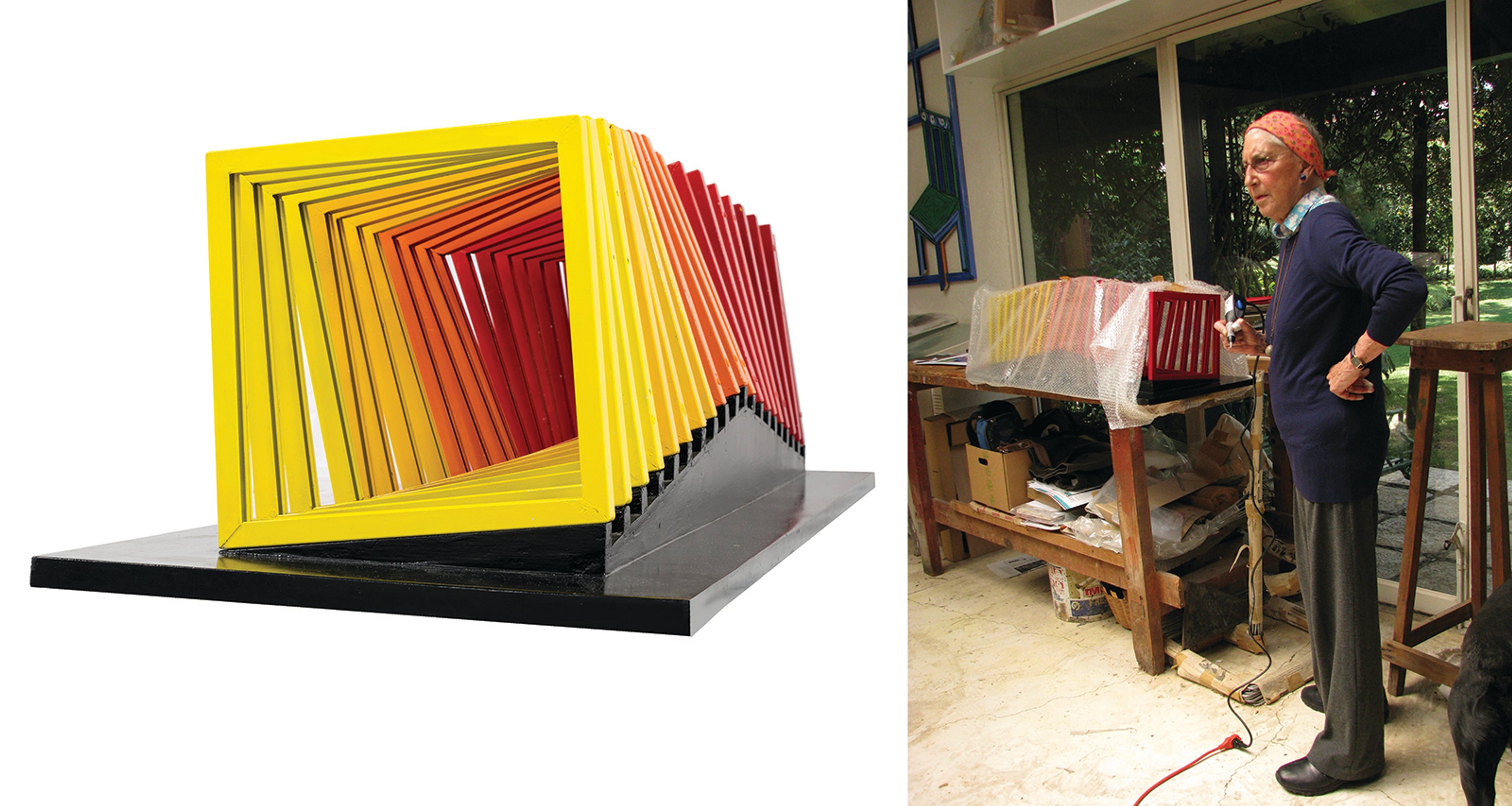 Helen Escobedo (1934-2010), showing with Proyectos Monclova, Mexico City. The late Mexican-British conceptualist Helen Mescobedo created monolithic public installations inspired by natural forms. Proyectos Monclova is showing her lacquered aluminium maquette (1979) for the work Coatl (1980), one of her best-known installations. Titled after the Aztec word for “serpent” and made of 15ft-tall orange and yellow serpentine girders, the work is installed at the National Autonomous University of Mexico. Around this period, Escobedo also created contrasting ephemeral public works of art made of natural materials that aimed to address the impermanence of artistic artefacts. Helen Escobedo with maquette for Coatl (1979) in her studio.