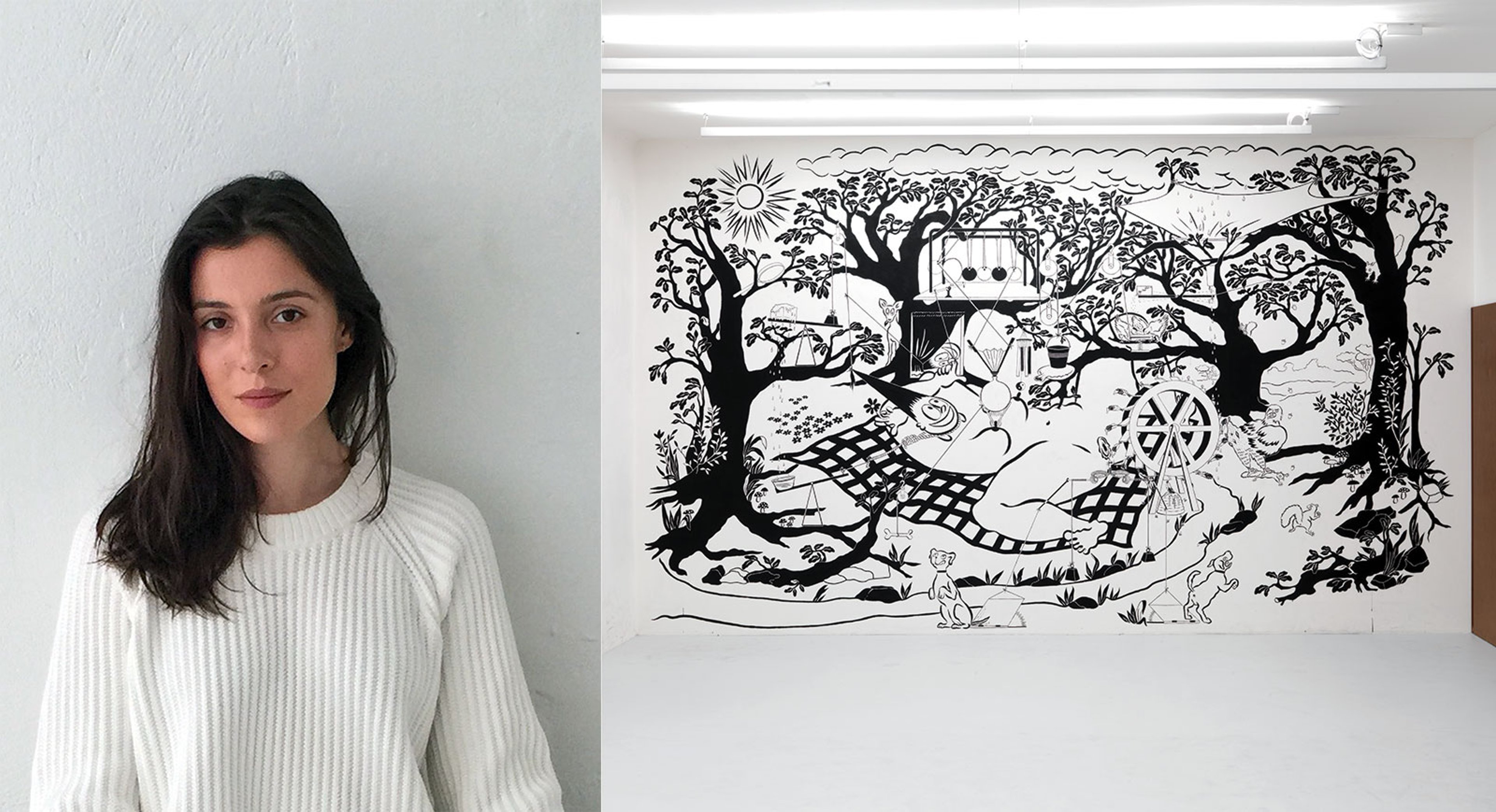 Ebecho Muslimova (b. 1984), showing with Galerie Maria Bernheim, Zurich. Muslimova was studying sculpture at Cooper Union when she began sketching ribald cartoons of a grinning, gymnastic alter ego she dubbed Fatebe in the back of her notebook. The character is defined by her flesh: crouching Fatebe offers up her breasts in her hands, prone Fatebe uses a rope-and-pulley system to sprinkle Gold Bond body powder on her itchy nether regions. "They’re not self-portraits, but her body relates to my body. Things that I can’t say or do or perform myself, she can do for me." Above, Ebecho Muslimova, How the Sensuality in Me Scatters (2017) Photo: Jaka Babnik