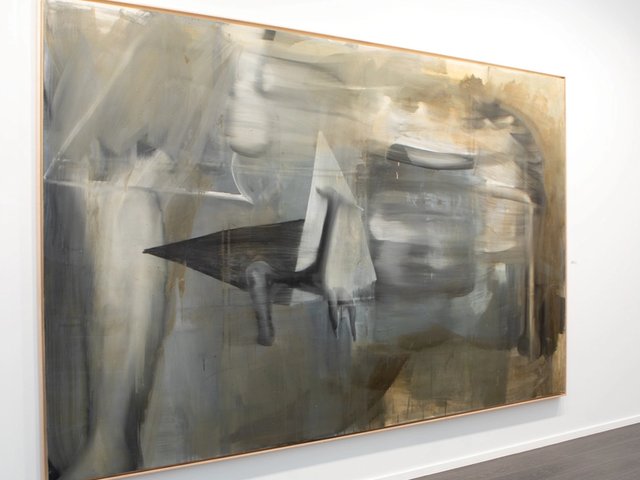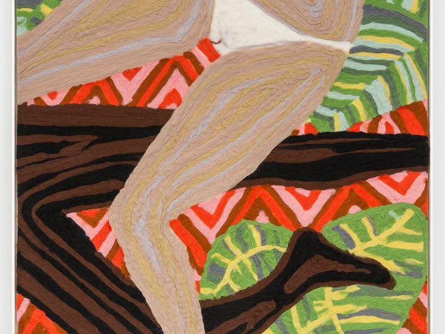 Sue Williams, Hooray (2018) at 303 Gallery: Minter is an avowed fan of Sue Williams’s work, calling the New York-based artist a “genius”. This piece takes on the serious topic of American militarism and politics, but is also funny. “There’s an almost-flag, a woman with boobs—it’s all political,” Minter says, also pointing out a man on the toilet with a Trumpian air. “Everything [Williams] does is political, even though it looks like abstraction,” says Minter, who is also drawn to an earlier work on the stand, The Pink Object (2003), an oil and acrylic on canvas featuring brightly coloured loops. Sue Williams; courtesy of 303 Gallery