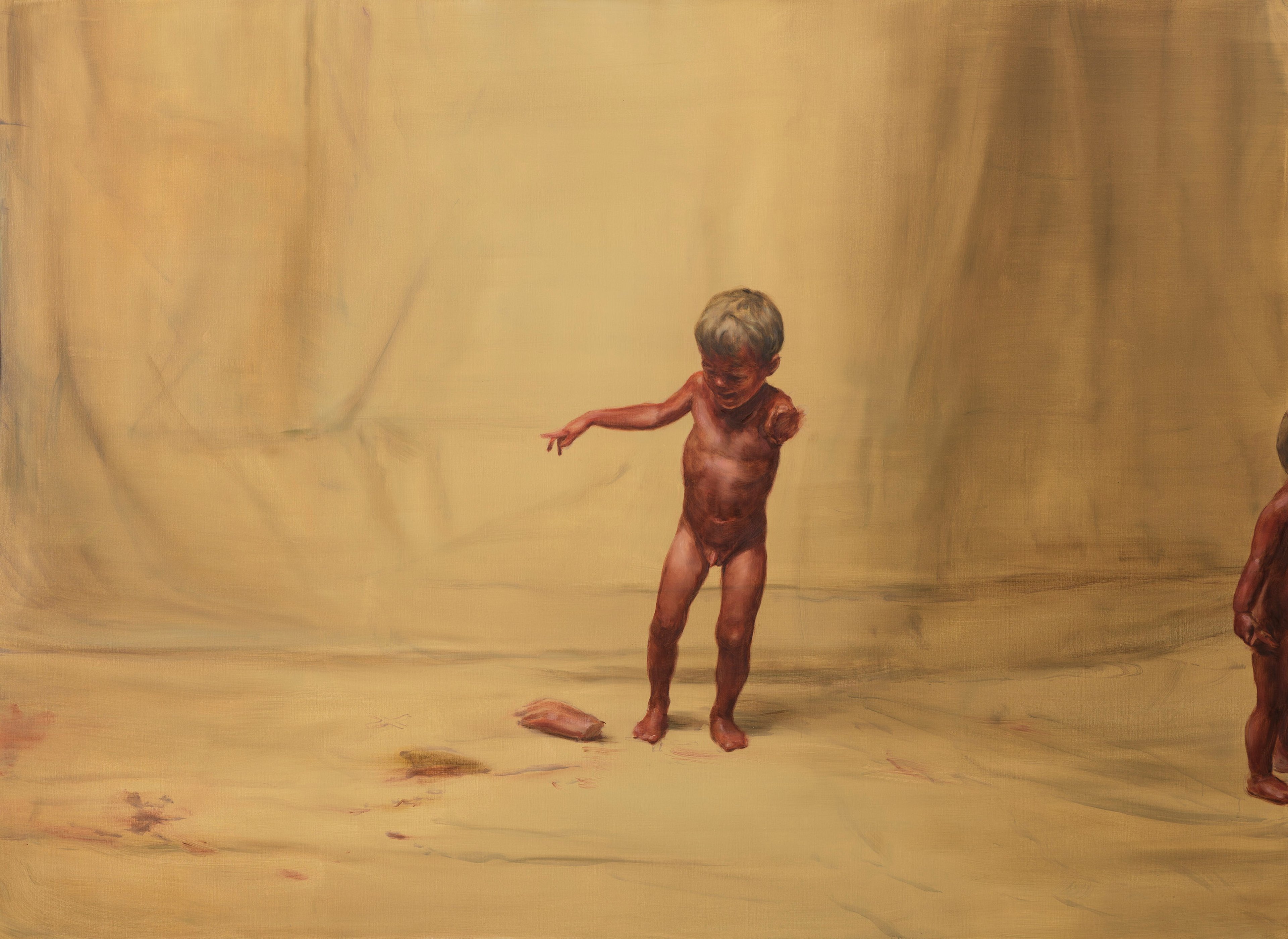 Michaël Borremans's Fire from the Sun (Two Figures, One Hand) (2017), David Zwirner, Frieze London: This painting by the Belgian artist Michaël Borremans will make you want to curl up in a ball and weep. The work shows a naked toddler, missing an arm and covered in what looks like blood. “When you are looking at the subject matter depicted in the painting, you immediately look at the materiality of the painting: are you looking at blood, or are you looking at paint?” says the gallery’s senior partner, Hanna Schouwink. It is difficult to concentrate on the weight of the artist’s brushstrokes when such a scene is staring you in the face. © Michaël Borremans; Courtesy of the artist and David Zwirner