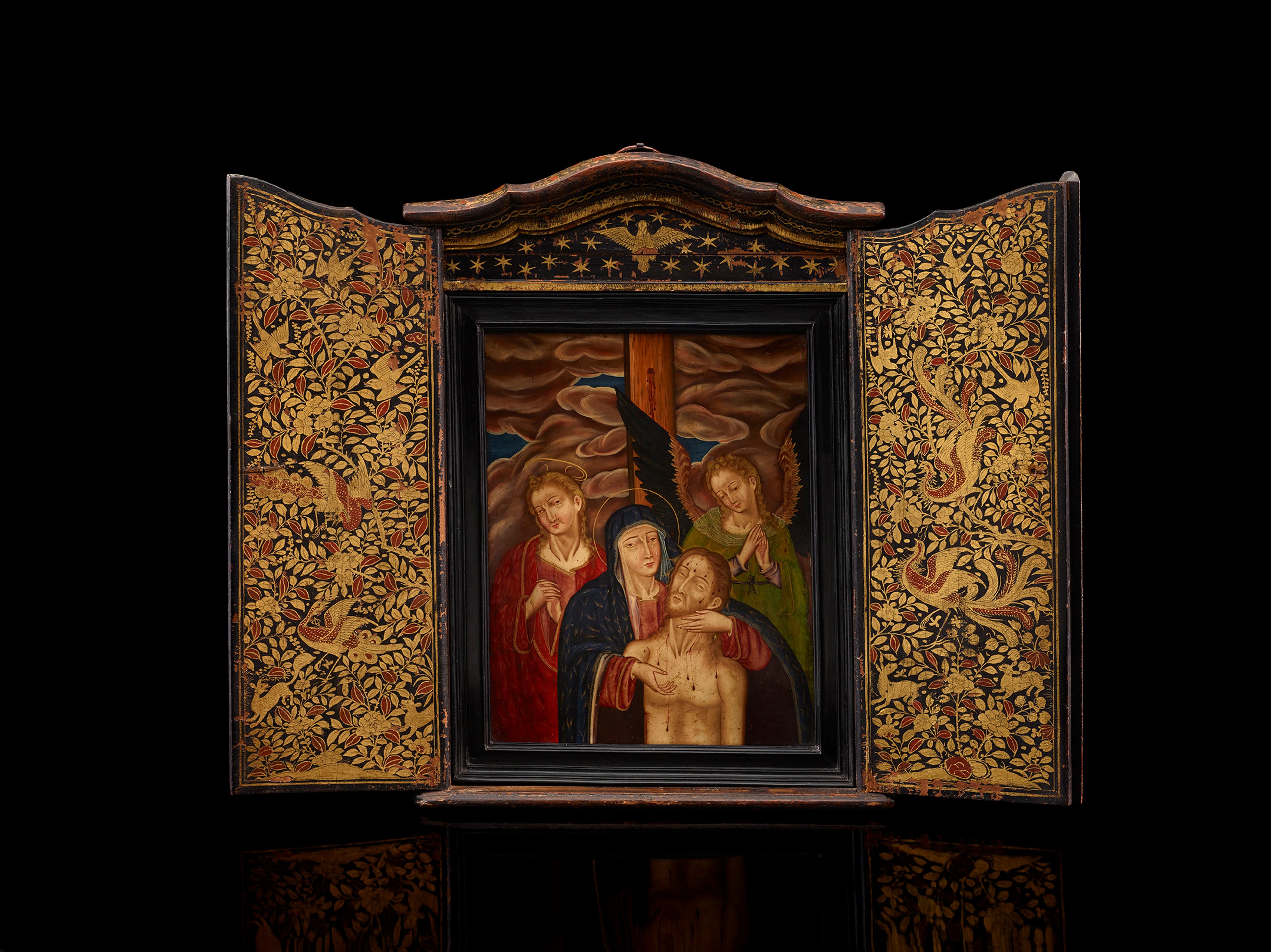 Portable oratory (early 17th century), AR-PAB, Alvaro Roquette & Pedro Aguiar-Branco, Frieze Masters: There is crying galore in this lamentation of Christ, with the tears of three female figures mirroring the blood of the dead Jesus. The 17th-century work was made in southern China for the European market, most likely a Portuguese or Spanish buyer, according to a spokesman for the gallery. The Christian subject matter in oil is juxtaposed with beautiful lacquered and gilded doors decorated in a Chinese style; the flora and fauna around the outside seem bizarrely detached from the inside. Most surviving Asian portable icons from the period are Japanese, so this is a rare Chinese example: made in China, but not as we know it. It could be yours for €147,500. Courtesy of AR-PAB, Alvaro Roquette & Pedro Aguiar-Branco
