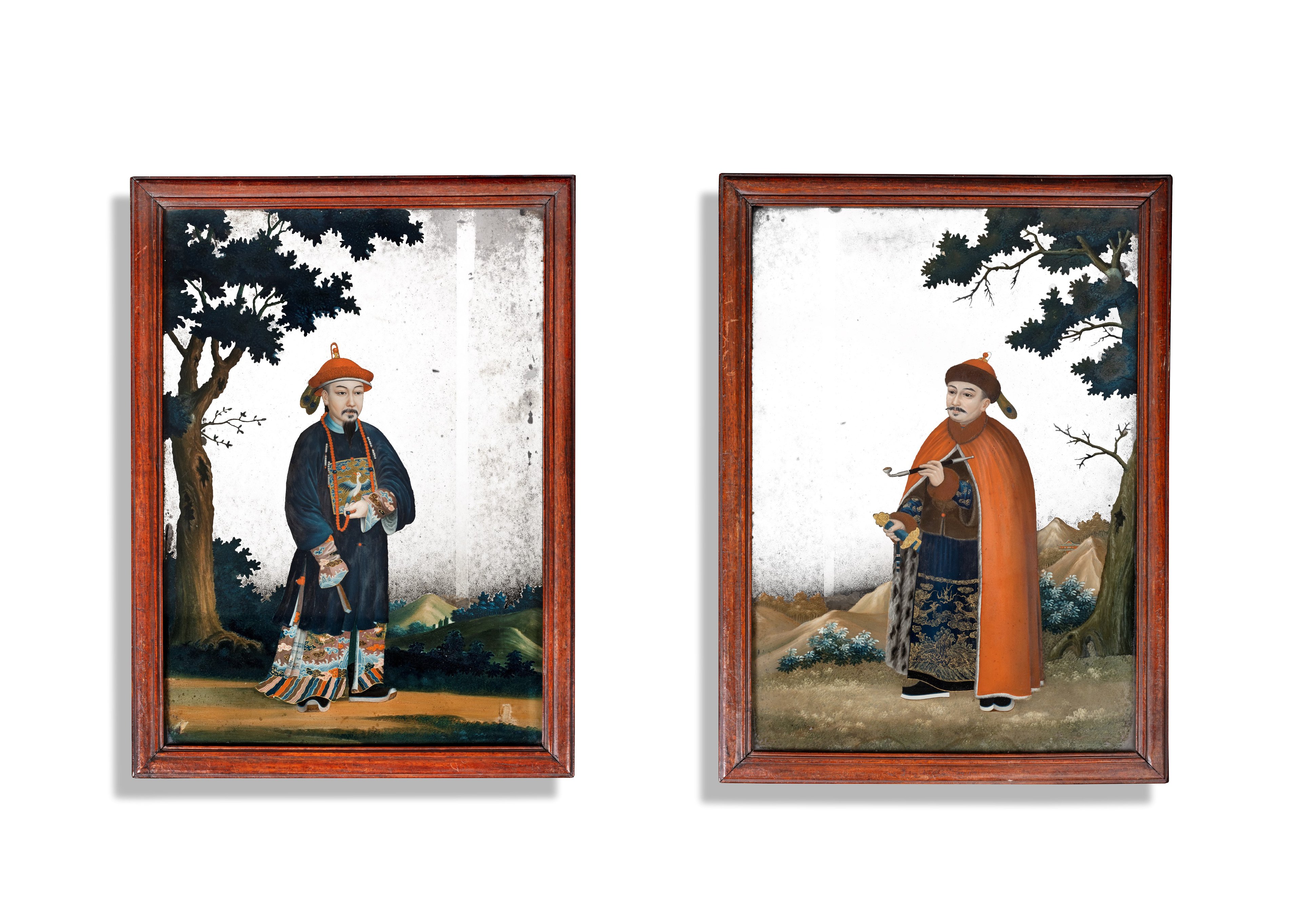 This pair of Chinese Export reverse mirror paintings (1750), painted on glass, were sold by Thomas Coulborn & Son for £24,000 Courtesy of Thomas Coulborn & Son