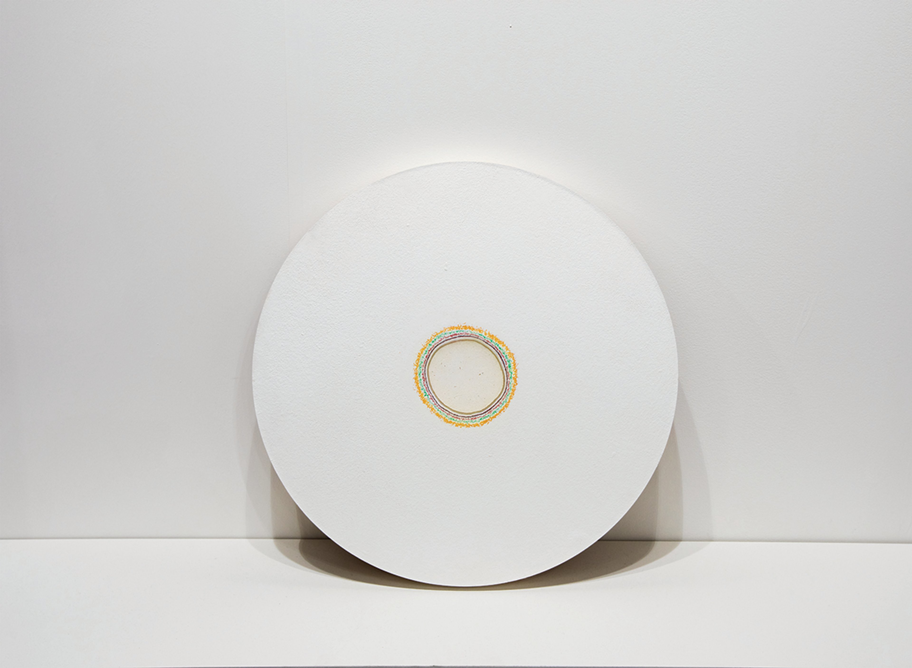 Pierre Huyghe, Timekeeper (Drill Core) Consortium (2018), Galerie Chantal Crousel: “This is almost a target. It reminds me of a target or a flower, which is basically the same thing. Huyghe does very different kinds of work. I like what he does because there is the involvement with the physical world, he goes into caves and stuff like that. For this work he sanded the surface of a wall so you can see the layers of paint that came before. I also like how it’s installed [on the floor of the stand]. He doesn’t want the work to be hung on the wall because it is a wall itself.” © David Owens