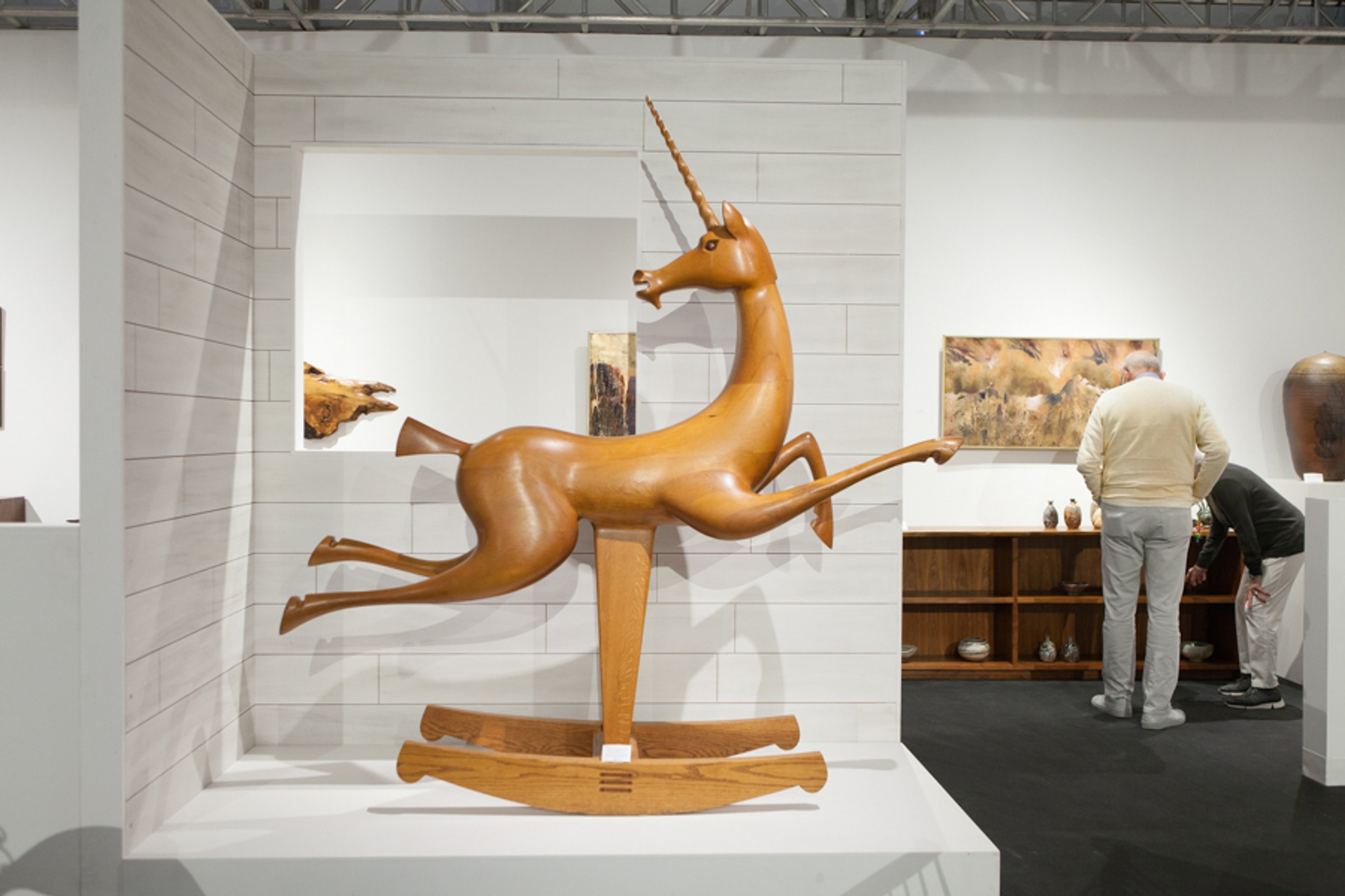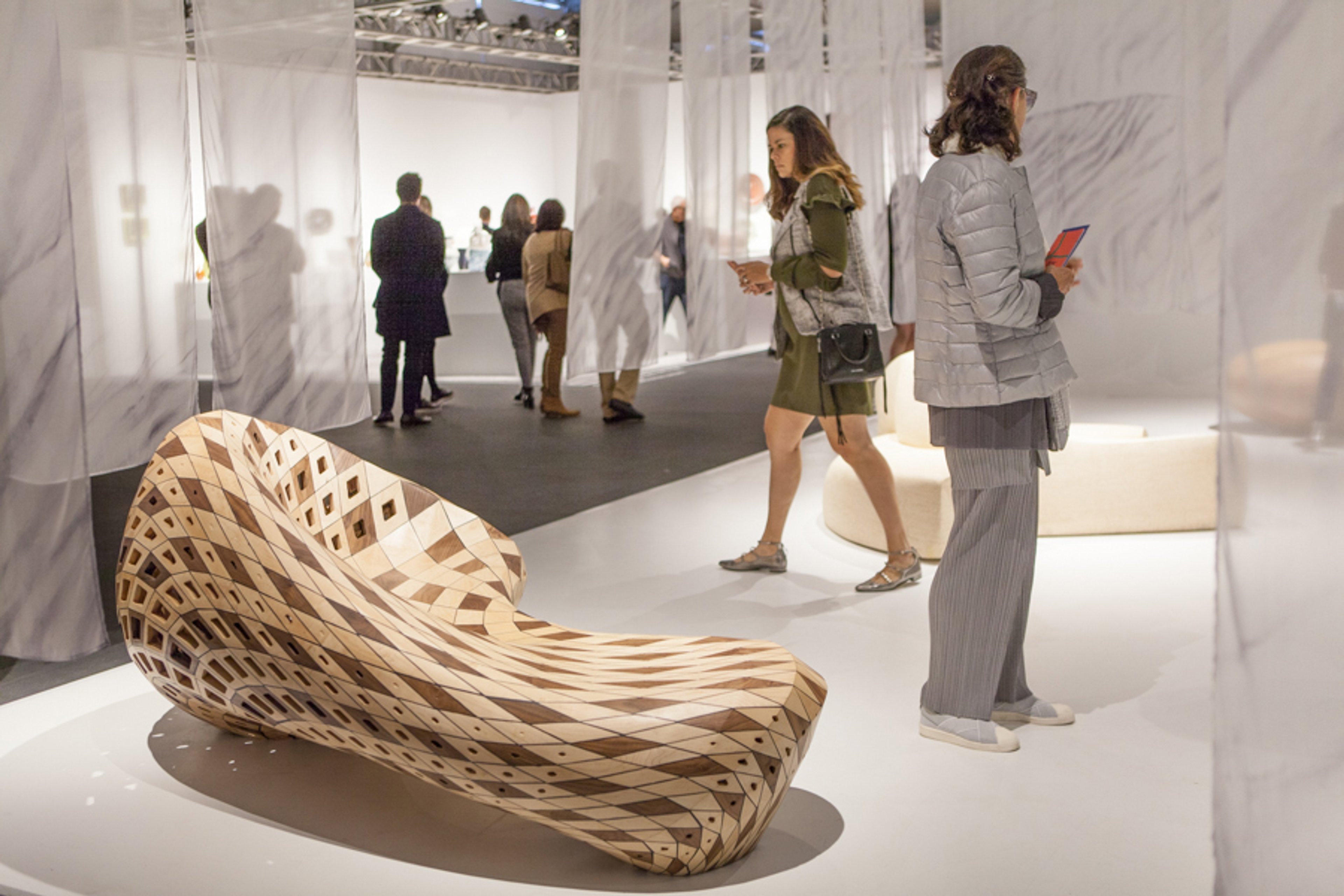 The New York-based gallery Friedman Benda’s stand is a zen-like space in the middle of the bustling fair. Fluttering marbled fabric, designed by Calico Wallpaper, encloses a contemporary take on the traditional Japanese rock garden. The Dutch designer Joris Laarman put together his sculptural bench—made up of intricate diamond-shaped pieces of maple and North American walnut—so that the geometric forms created a smooth, pebble-like wood sculpture. Joris Laarman Maker bench (Diamond) (2018) Friedman Benda; prices on the stand range from $16,000 to $135,000. Photo: © Vanessa Ruiz
