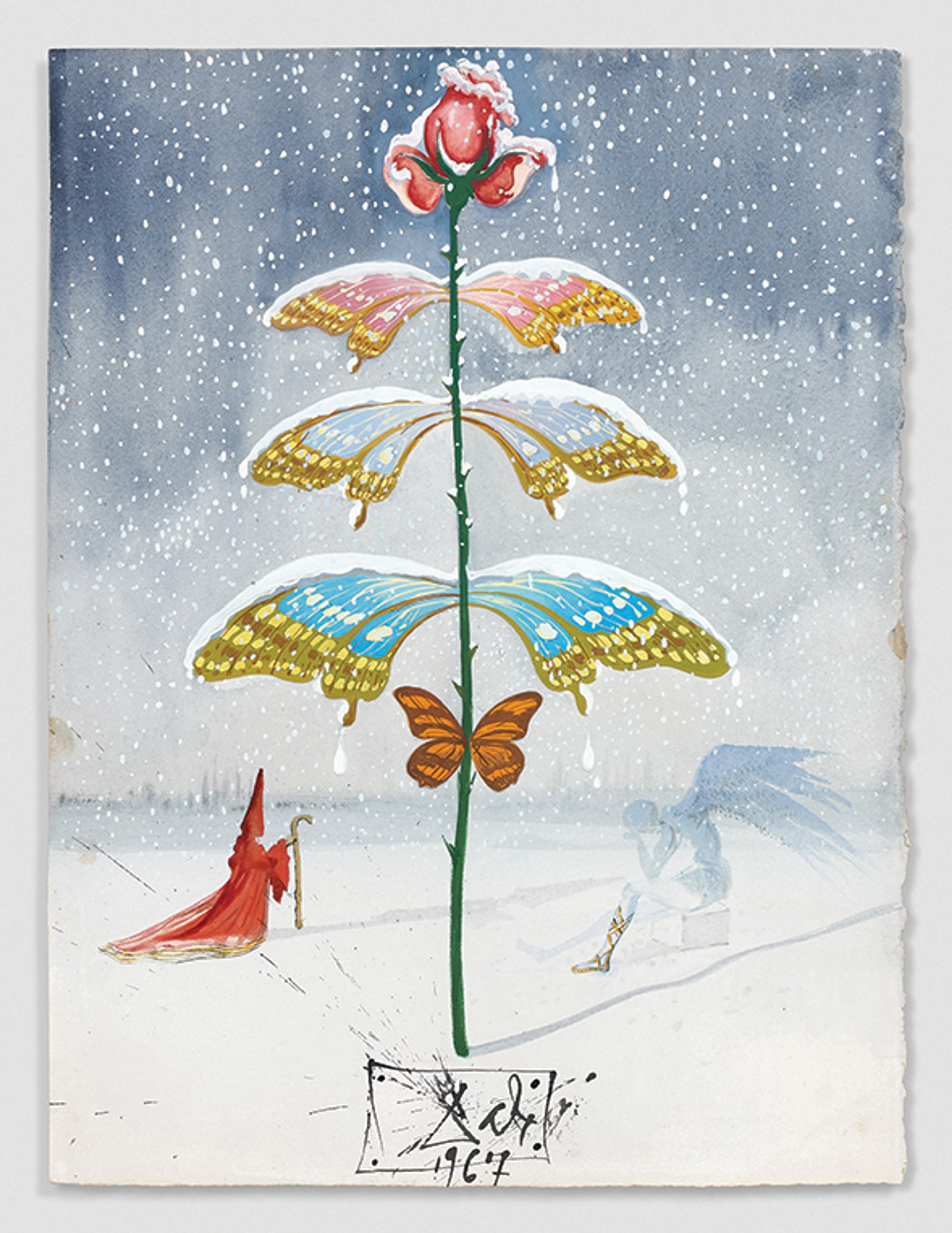 Every year between 1959 and 1976, the Spanish pharmaceutical laboratory Hoechst Ibérica commissioned Salvador Dalí to design illustrations for its company greetings cards—which was unusual, as the artist accepted few commissions. The original illustrations were displayed for 20 years at the Gala-Salvador Dali Foundation in Dali’s hometown of Figueres, in north-western Spain, but now 15 of the gouache designs will be sold by Hoechst Ibérica through Artcurial. Some are Christmas themed, others reference medicinal plants, but another recurring subject is the chrysalis which, in the festive Mariposas, blossoms into a butterfly. Salvador Dalí, Mariposas (butterflies, 1967). Impressionist and Modern Art auction, Artcurial, Paris, 4 June. Estimate €60,000-€80,000.
