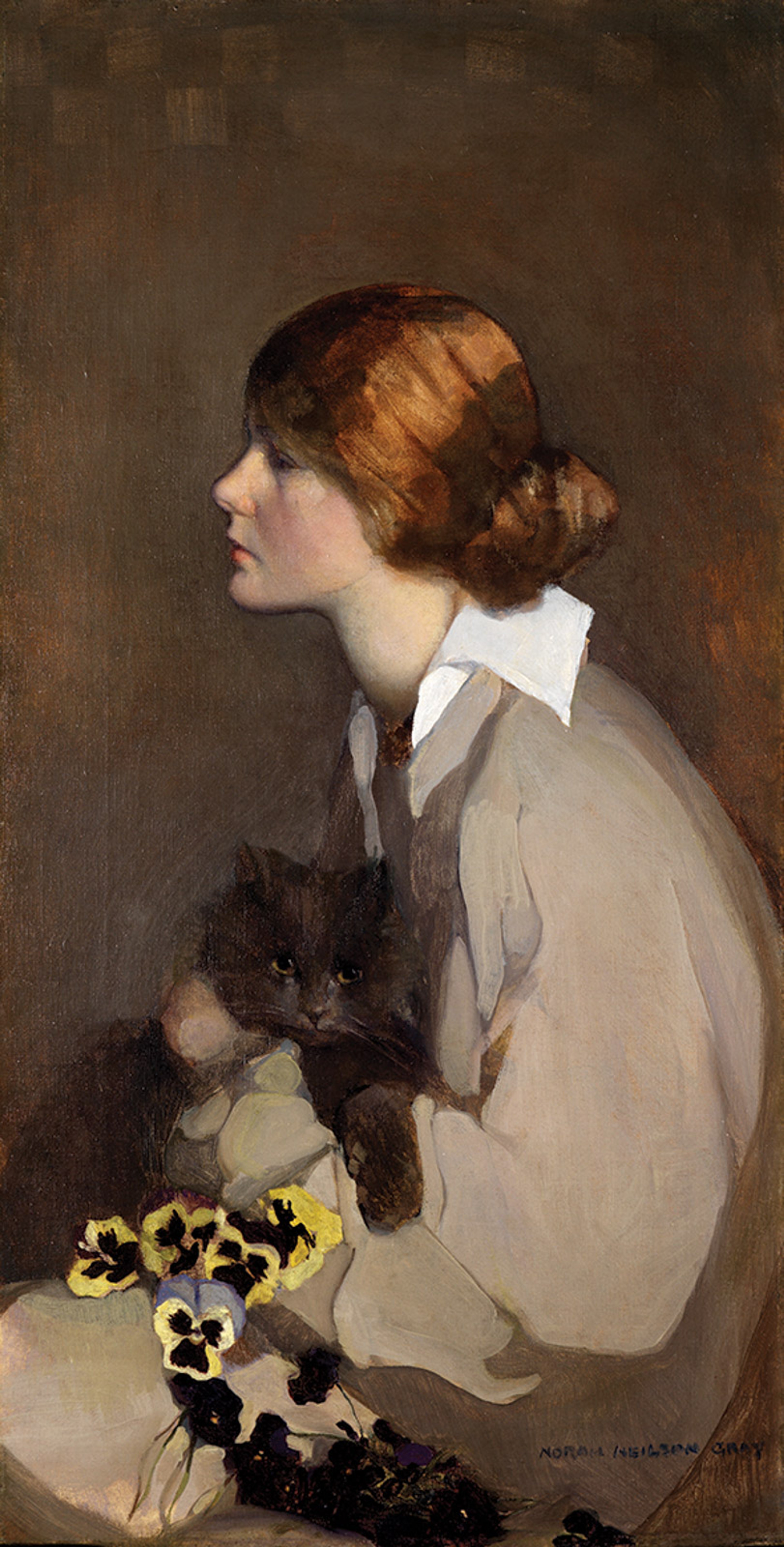 Norah Neilson Gray became the foremost painter of the so-called “Glasgow Girls”, a circle of influential Art Nouveau artists and designers who flourished in the city at the turn of the last century and pioneered a distinctive Scottish style. She later became a teacher at the Glasgow School of Art, where she was known to her students as “Purple Patch” because of her assertion that there is colour in shadow and darkness. The model in this painting is likely one of the artist’s sisters, but the real star of the show is the cat in her arms, whose bright yellow eyes—offset, of course, by charcoal fur with the occasional slight purple tint—are the work’s namesake. The piece is available from The Maas Gallery, priced €85,000. Norah Neilson Gray’s Golden Eyes (1917). Courtesy of Artmedia Press. For sale with the Maas Gallery