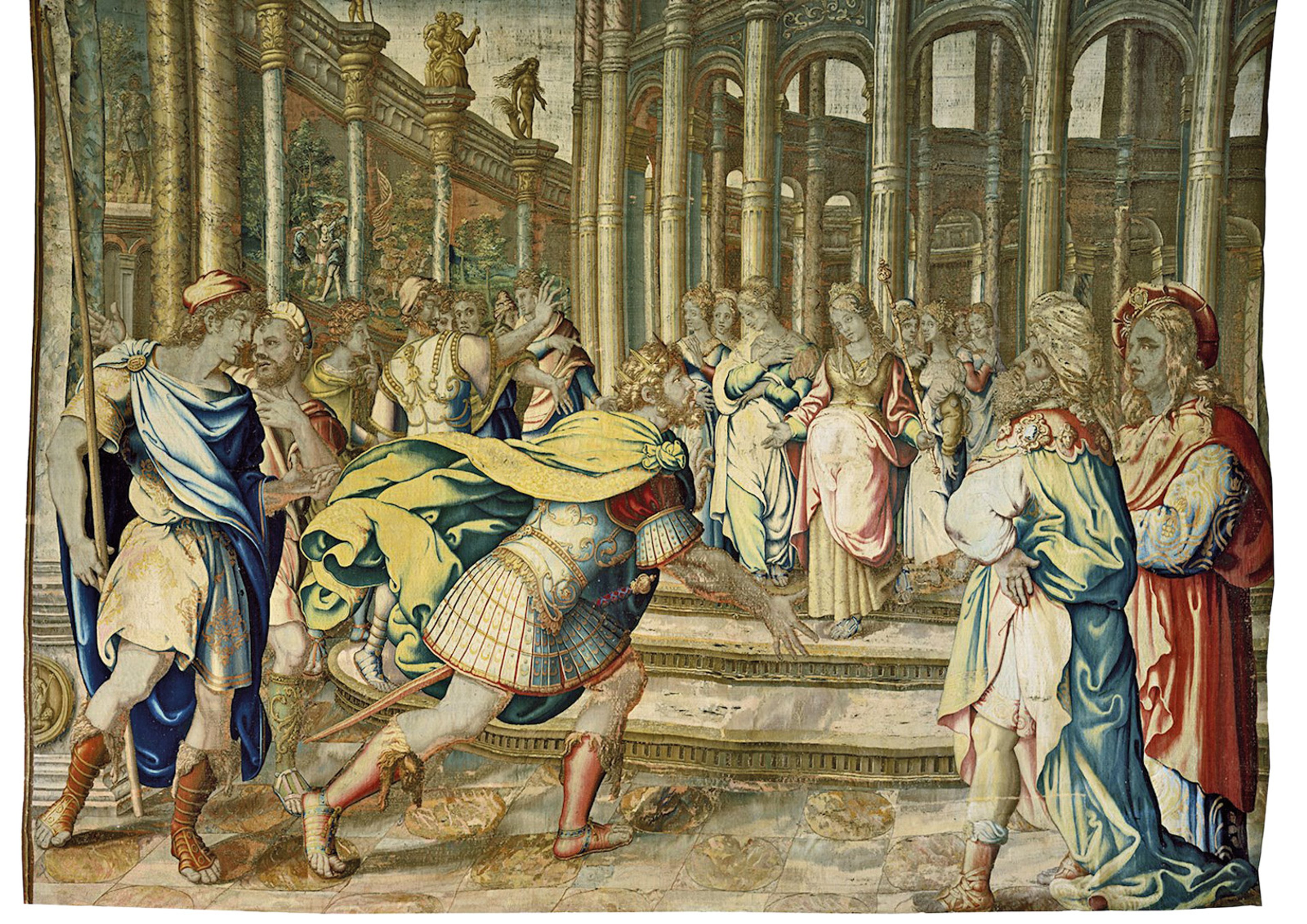 This tapestry was made from a design by Perino del Vaga, who had been in Raphael’s workshop and became a highly sought-after decorative painter in the latter half of the 16th century. He was employed by the Genoese prince Andrea I Doria (1466-1560) to design and decorate his palace outside Genoa. To live up to his noble status, Doria acquired some 200 tapestries—the sine qua non of super-luxury goods—including a six-piece set designed by Perino on the stories of Aeneas. The cartoons made their way to other weavers, despite Doria’s desperate attempts to exert exclusive rights to them. This tapestry is unusual in having been woven in England at the Mortlake tapestry manufactory, which was set up by King Charles I who, like Doria, felt the need to underline his magnificence. Mortlake tapestries are relatively rare as the king’s property was dispersed, destroyed or lost after his execution and the manufactory was effectively finished off at his death. This piece has the additional lustre of having come from the Bavarian Schloss Neidstein, recently the home of the US film star, Nicolas Cage. Since Neidstein’s last descendent-owner died in 2004, the castle’s contents have been gradually sold off, hence this tapestry’s immediate provenance. Its asking price at S Franses is £1m. Perino del Vaga’s Dido Welcoming Aeneas (1643). For sale with S. Franses