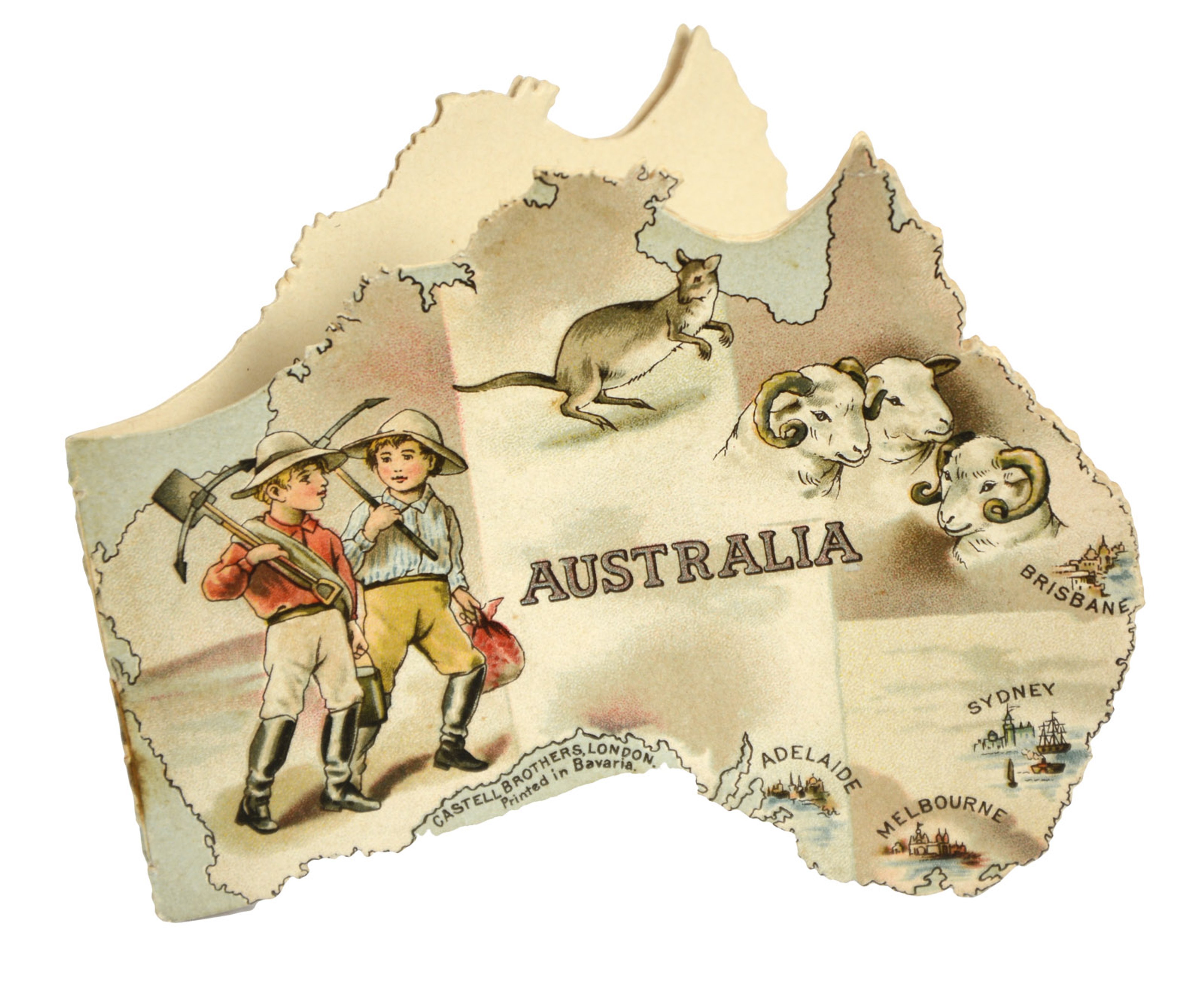 £1,000: in the 19th century it took four months to sail from the UK to Australia, but that did not deter the Castell Brothers from producing this little book to promote travel to Down Under. Its eight pages feature illustrations of Aboriginal people, sheep mustering and a bullock team. This example, exhibited by Shapero Rare Books from London, is in unusually good condition—many were given to children and the jagged edges quickly became somewhat battered. Castell Brothers, Australia (around 1890). Courtesy of Shapero Rare Books