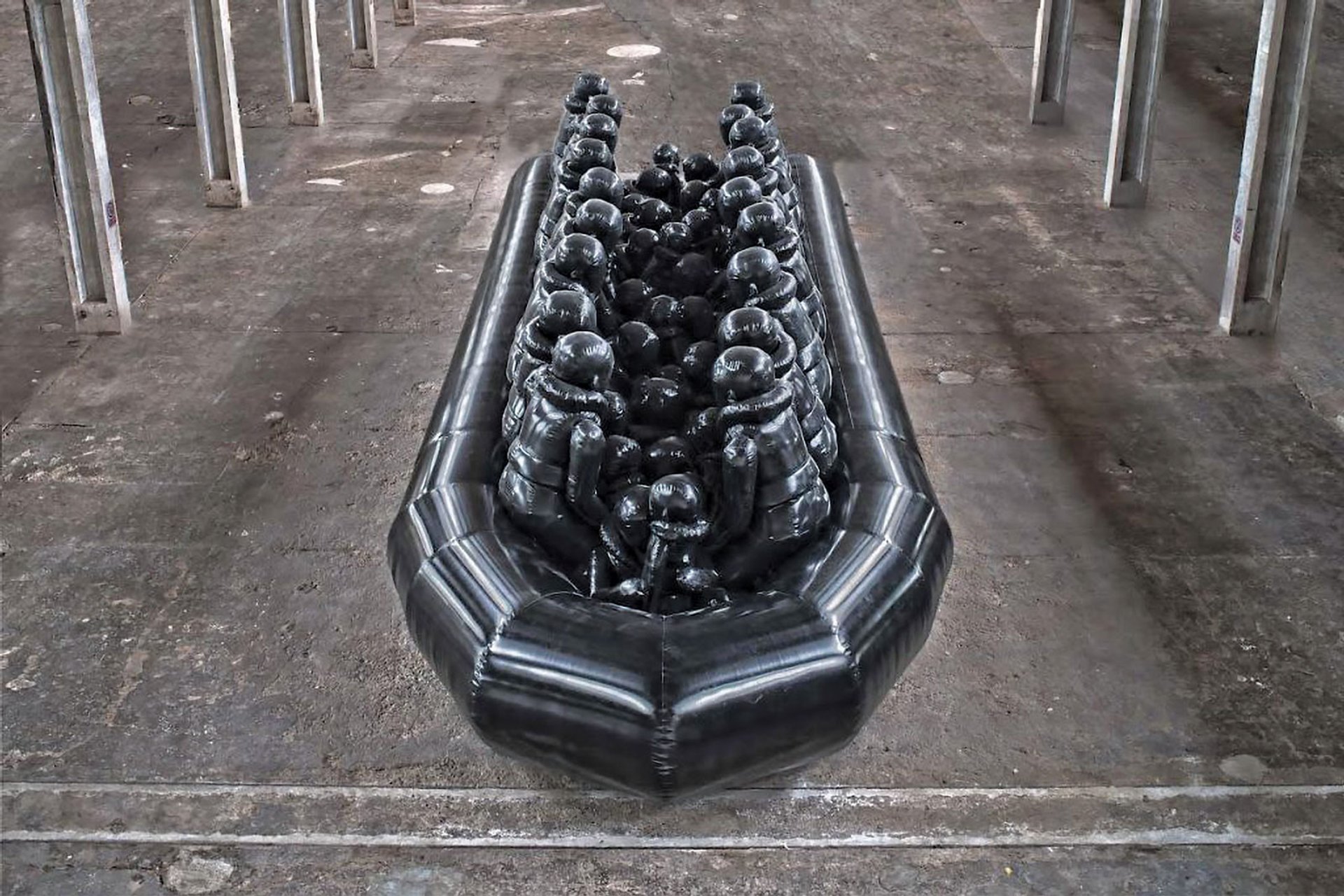 Ai Weiwei’s cast of a dinghy of refugees, Law of the Journey (Prototype A) (2017) in his show at Tang Contemporary Art Courtesy of Tang Contemporary