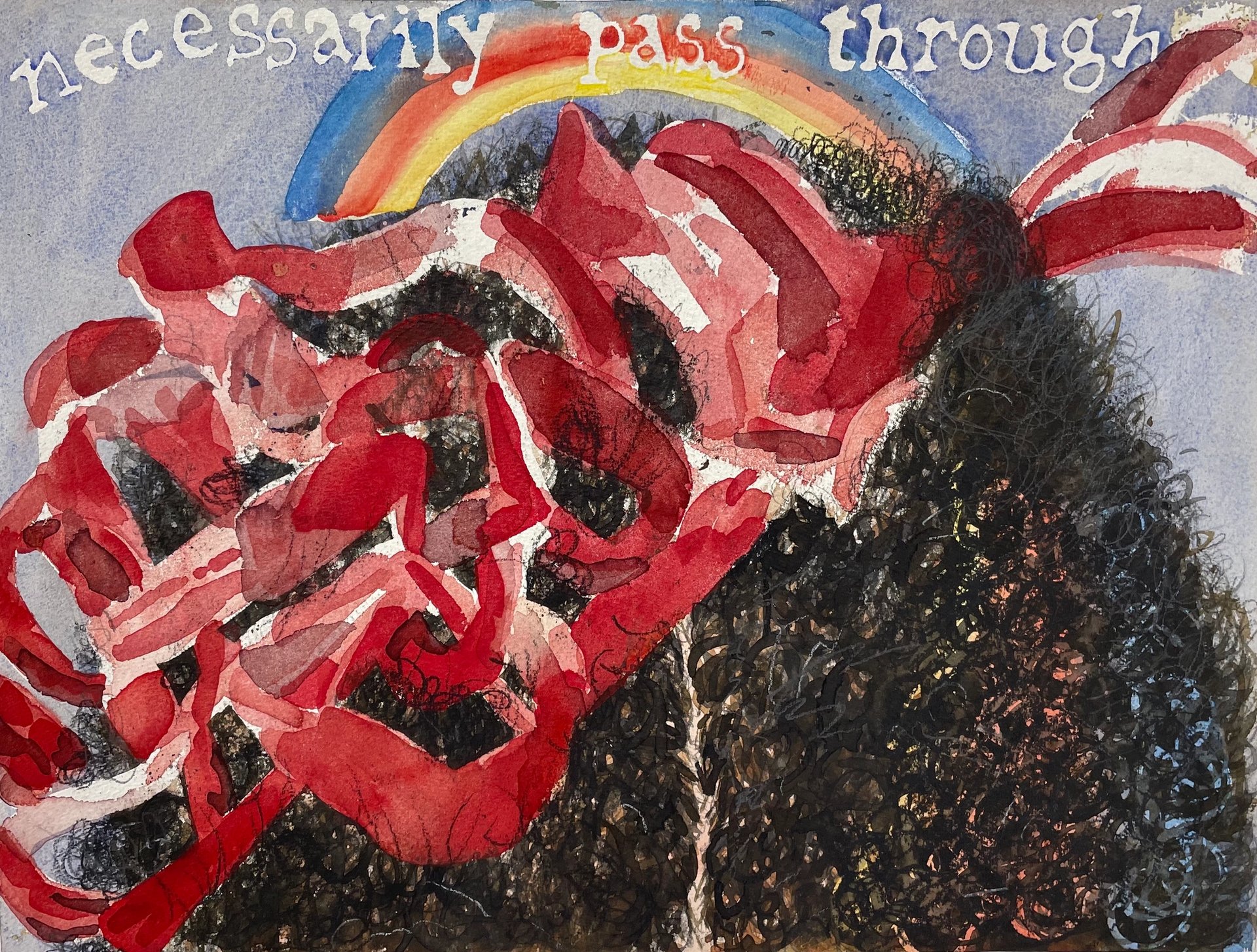 Despite the dark stories that run through her work, there is also a lot of joy and celebration. One watercolour on display at Bosse & Baum shows a Black woman, face obscured, running her hands through her massive Afro which takes up most of the composition. “This was about me trying to capture that feeling of not being able to comb my hair, so I have to run my hands through it instead, which is an incredible feeling,” she says. The figure is framed by a dark, starry night which creates the impression of a Black goddess shaking the stars out of her hair. “Yes, it’s like a myth about how the stars were created,” Montserrat says. The word “simply” floats at the top of the work, a reference, Montserrat says to the simplicity of the gesture of running hands through hair, which “feels good; it’s simple self care,” she says.