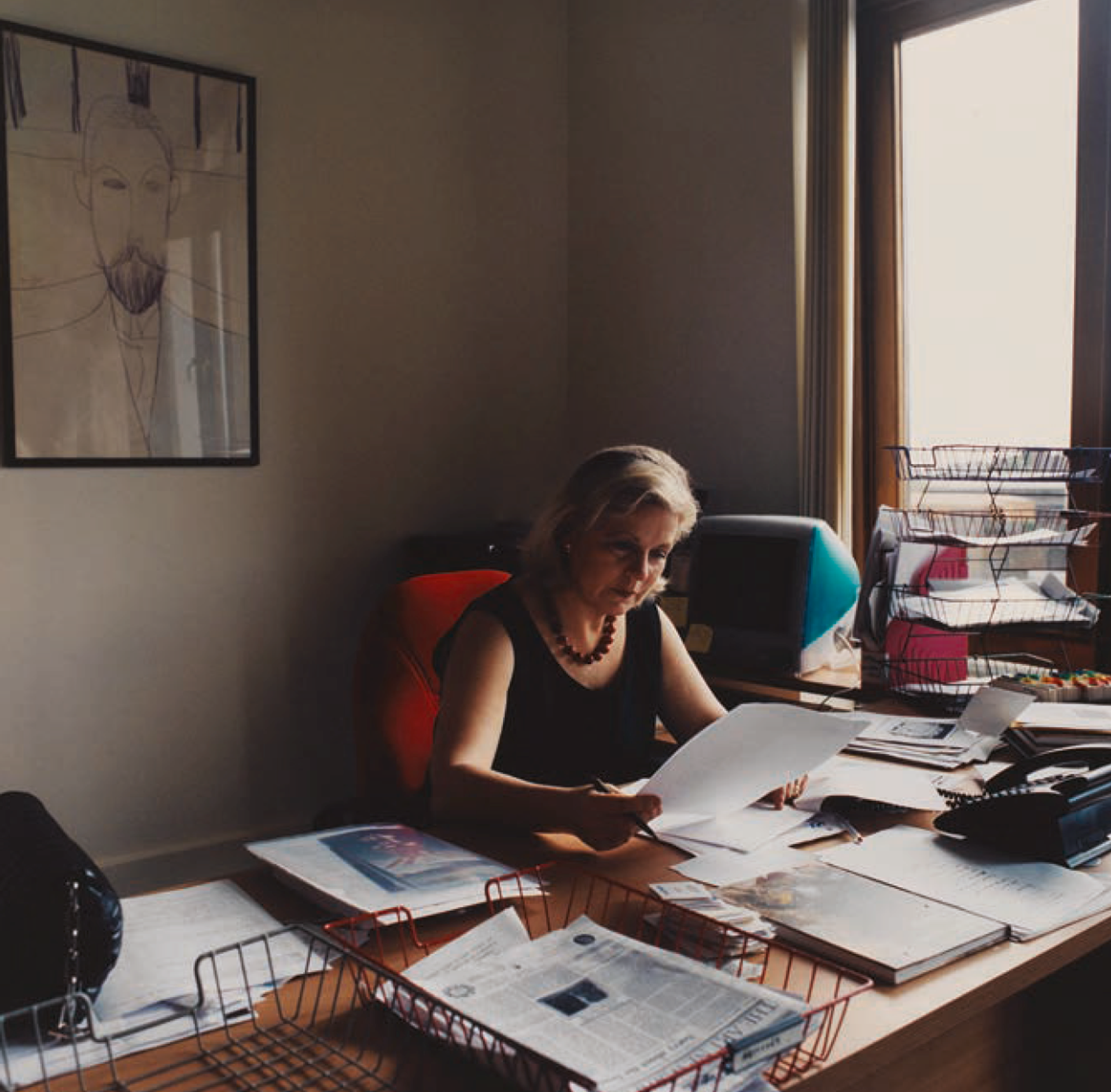 Anna Somers Cocks, pictured at her desk in 2001 by Lucy Anne Dickens for the National Portrait Gallery