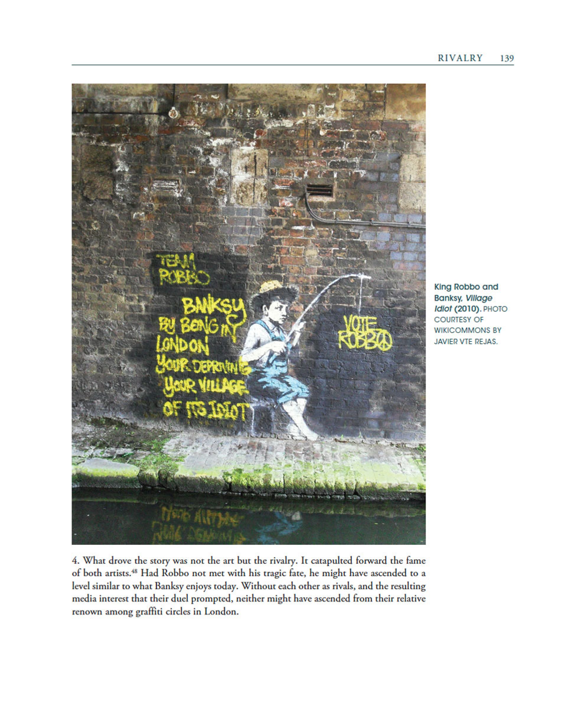 He elaborates on the forgotten feud between Banksy and another UK graffiti artist, King Robbo, who died in 2014. “Banksy is now a household name, but back in 2009, in the Camden Town neighbourhood of London, King Robbo was the monarch of graffiti art, and far more famous,” Charney writes.