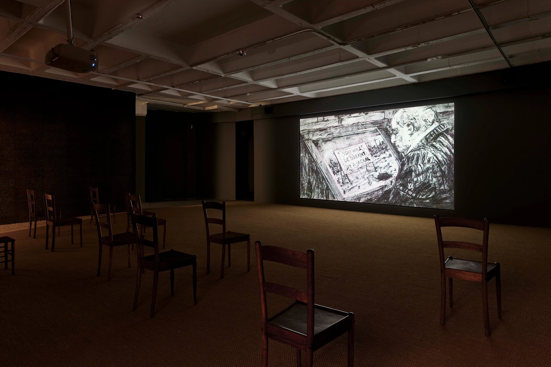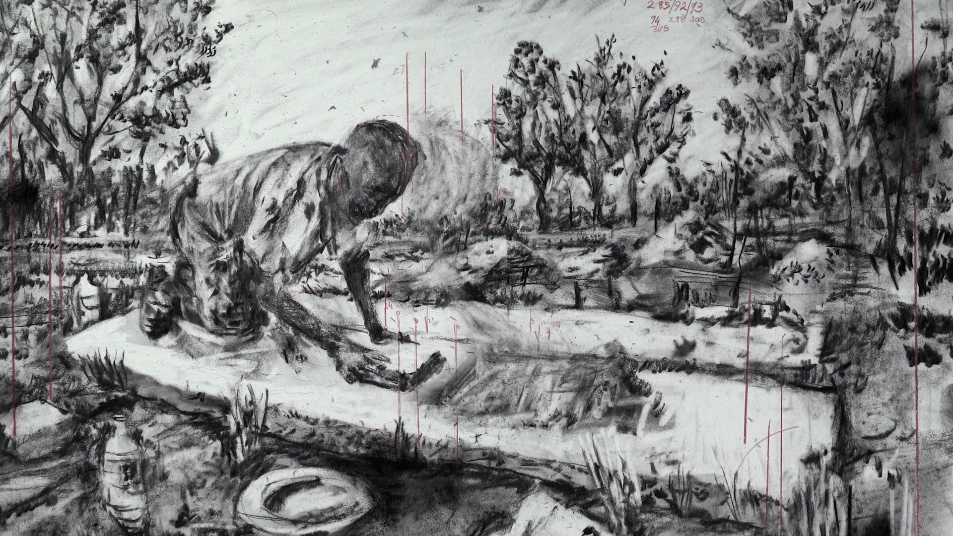 One of the fruits of this bountiful period of production has been a new animation, City Deep, which was finished this year. The 11th film in the artist's Drawings for Projection series, it continues to follow the main character Soho Eckstein, a middle-aged businessman in Johannesburg. In the animation he surveys post-industrial South Africa, with depictions of a crumbling Johannesburg Art Gallery juxtaposed with scenes showing the phenomenon of the Zama Zamas—illegal "artisanal" miners in South Africa who search old mines for remnants of gold. The film is on show alongside other recent works in his exhibition City Deep at Goodman Gallery in Johannesburg (6 October-12 November).