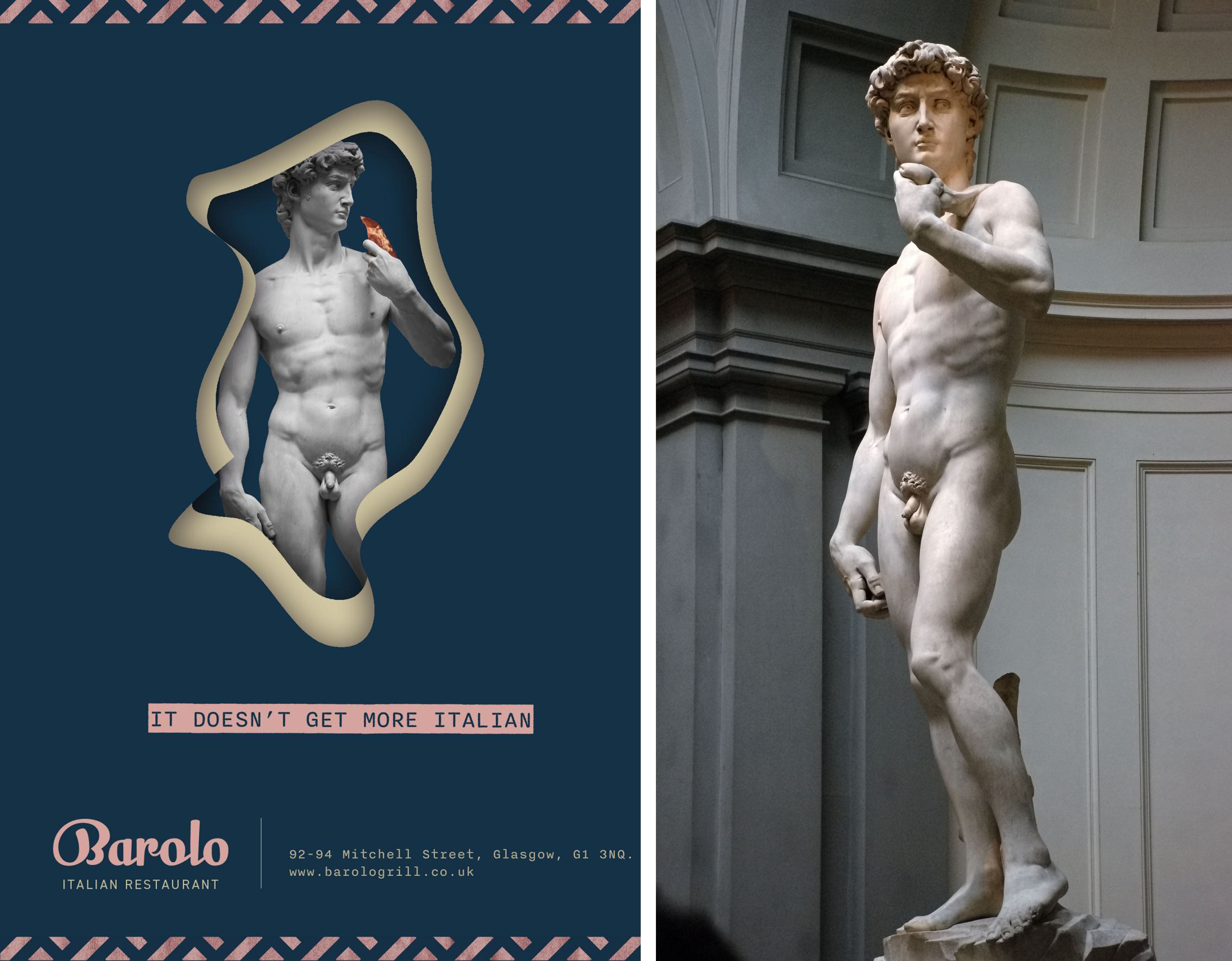 Glasgow's Barolo Restaurant will run posters with the sculpture visible only from the waist up after artwork with the masterpiece in full-view was rejected