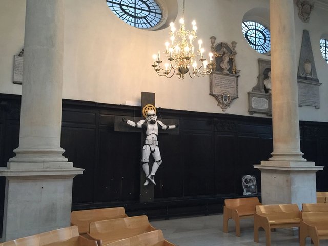 The stormtrooper on a cross is part of an exhibition due to open to the public on Thursday