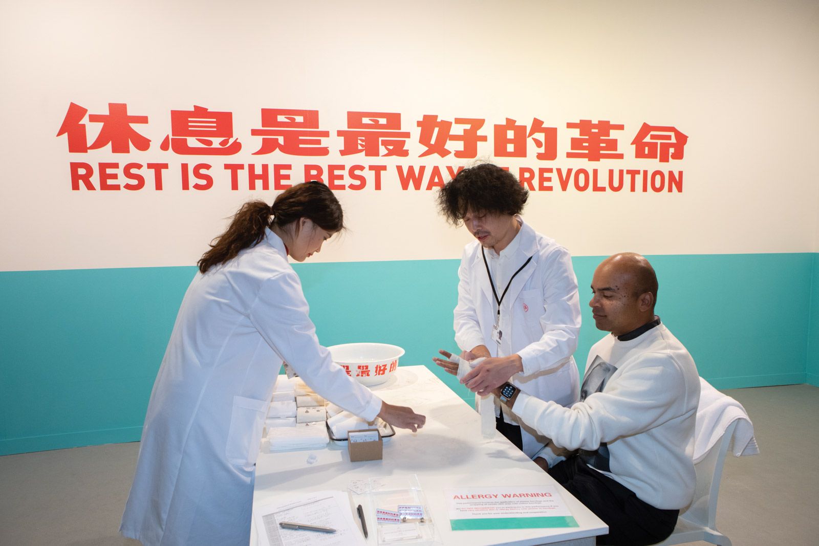 Don’t Forget to Breathe—three ghostly figures lit from within—are on show in an abandoned storefront