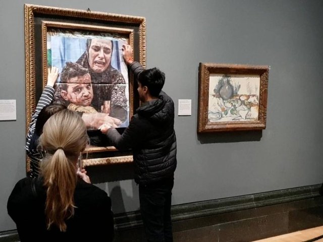 Members of campaign group Youth Demand covered the painting with an image of a Gazan mother and children