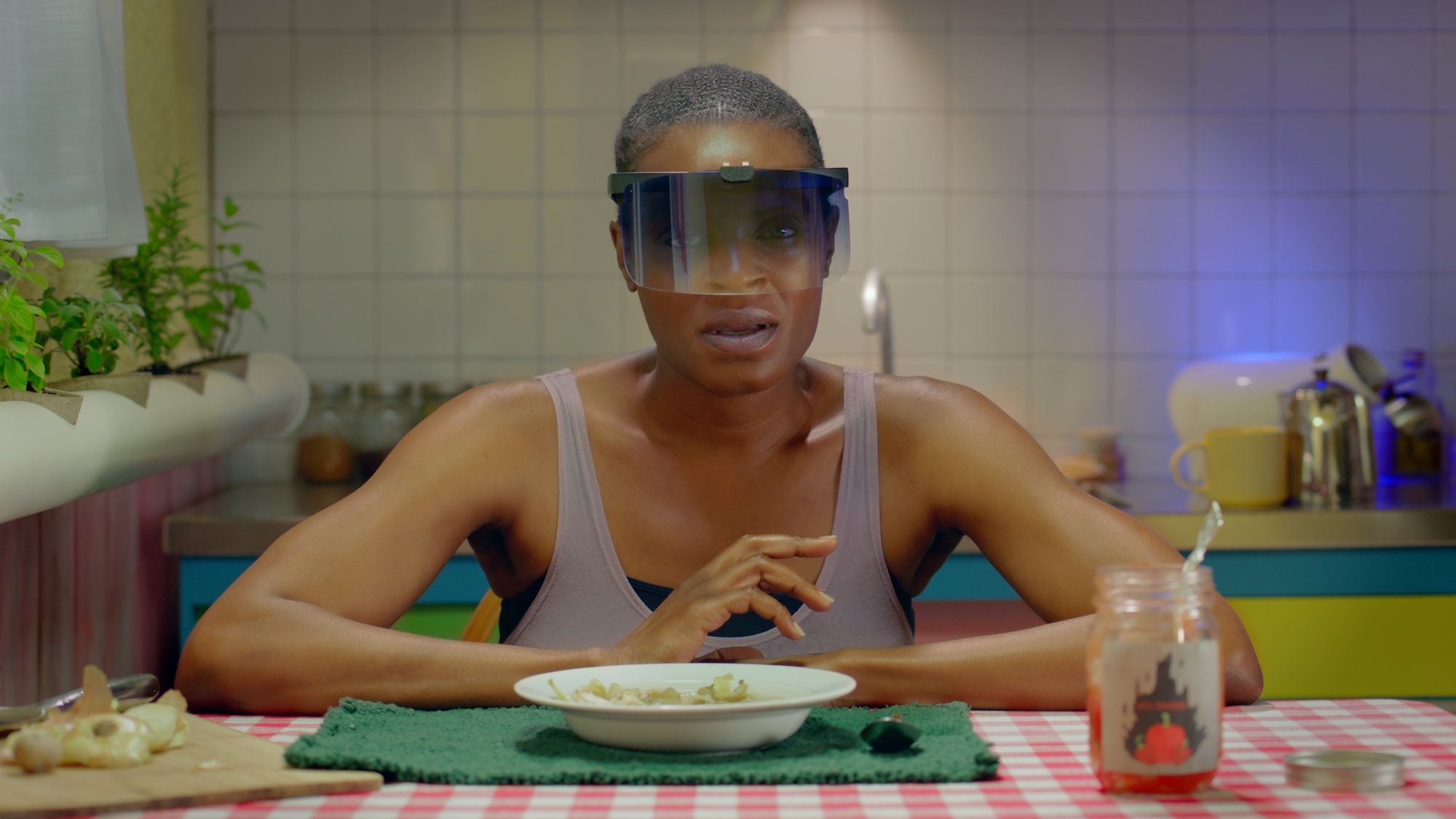 ‘Remote’, co-directed by Rottenberg and Mahyad Tousi, finds Okwui Okpokwasili’s main character escaping her apartment through virtual reality