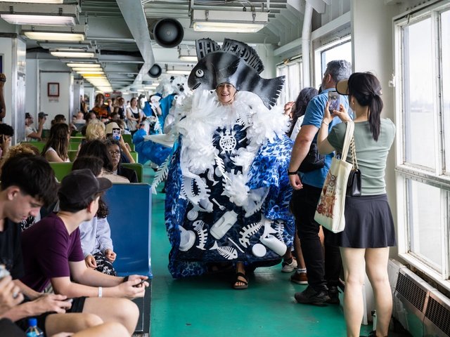 The artist and a cast of collaborators staged a colourful cautionary performance about the environment on the popular ferry