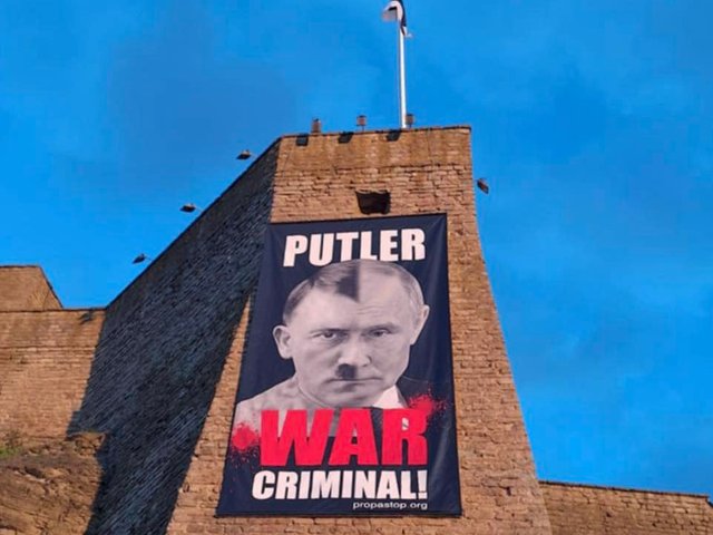 Russia charges Estonian museum director with ‘rehabilitating Nazism’ over Putin-Hitler banner