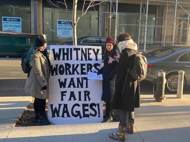 Whitney Museum staff protest against stalled contract negotiations at biennial’s VIP opening