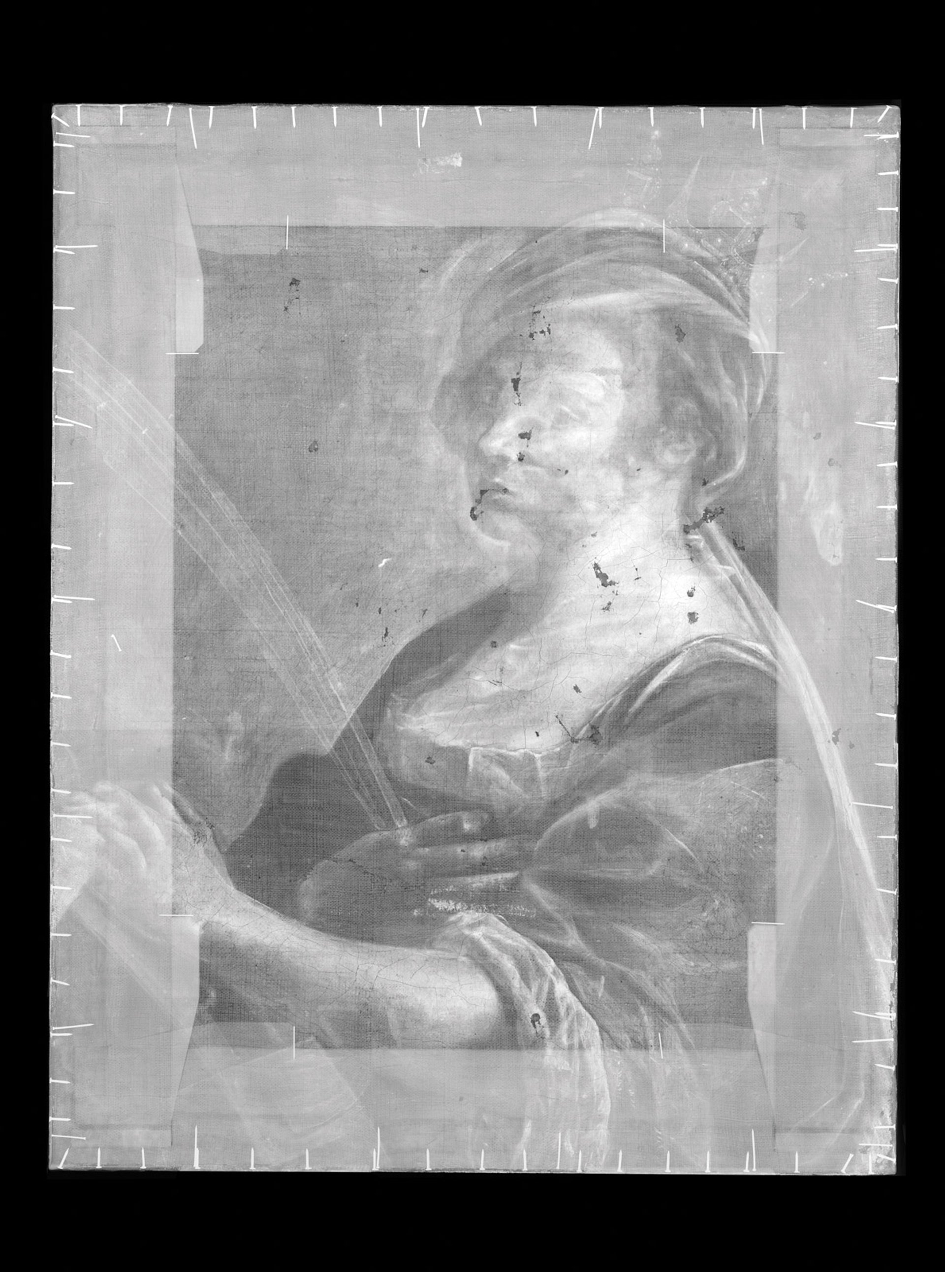 Letizia Treves, the curator of later Italian, Spanish and French 17th-century paintings at the National Gallery, said that her museum had provided the tracings of its self-portrait to the Uffizi and to the Wadsworth Atheneum in Hartford, Connecticut, for the sake of comparison. (The Wadsworth Atheneum owns the Gentileschi painting Self-Portrait as a Lute Player from around 1615-18, which also portrays its subject at half-length, seated with her face turned toward the observer.) The arms in the National Gallery’s tracing align with those in the Uffizi’s underpainting, Treves says; the head aligns with the one in the Wadsworth Atheneum’s painting.